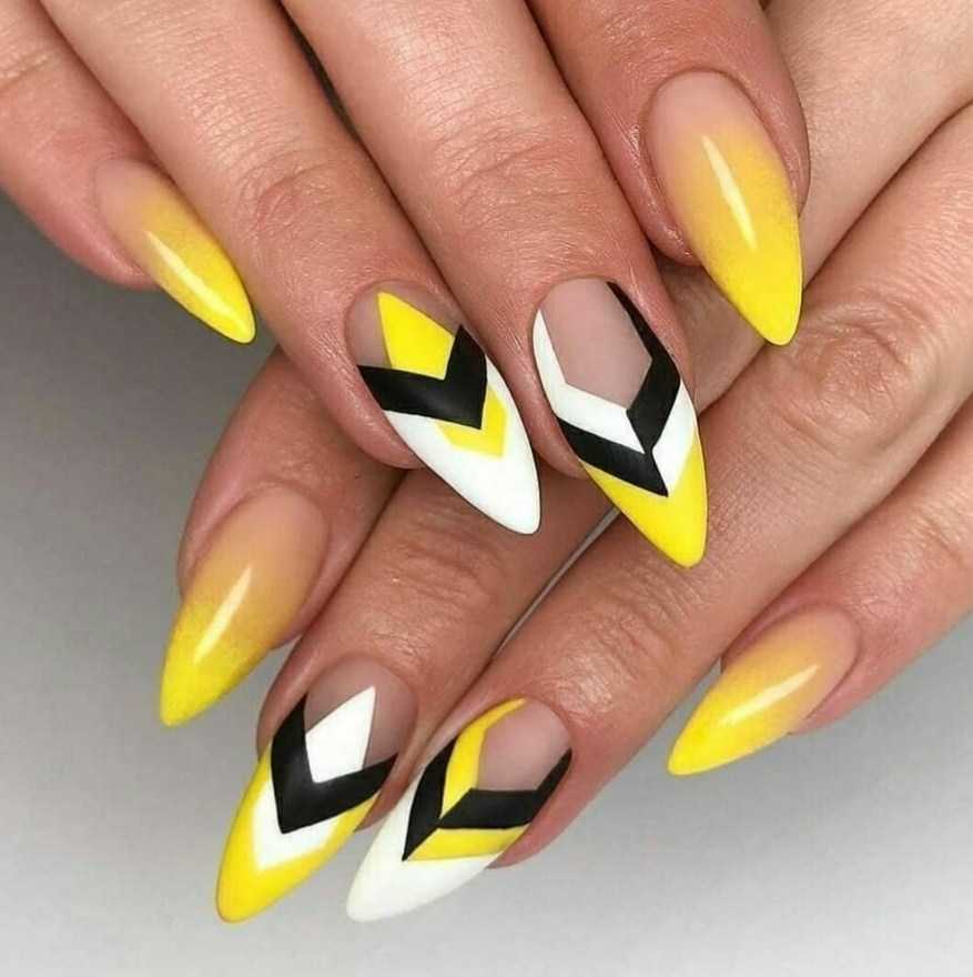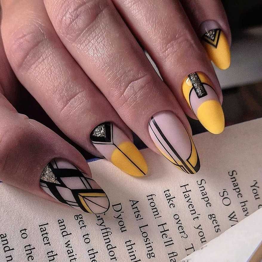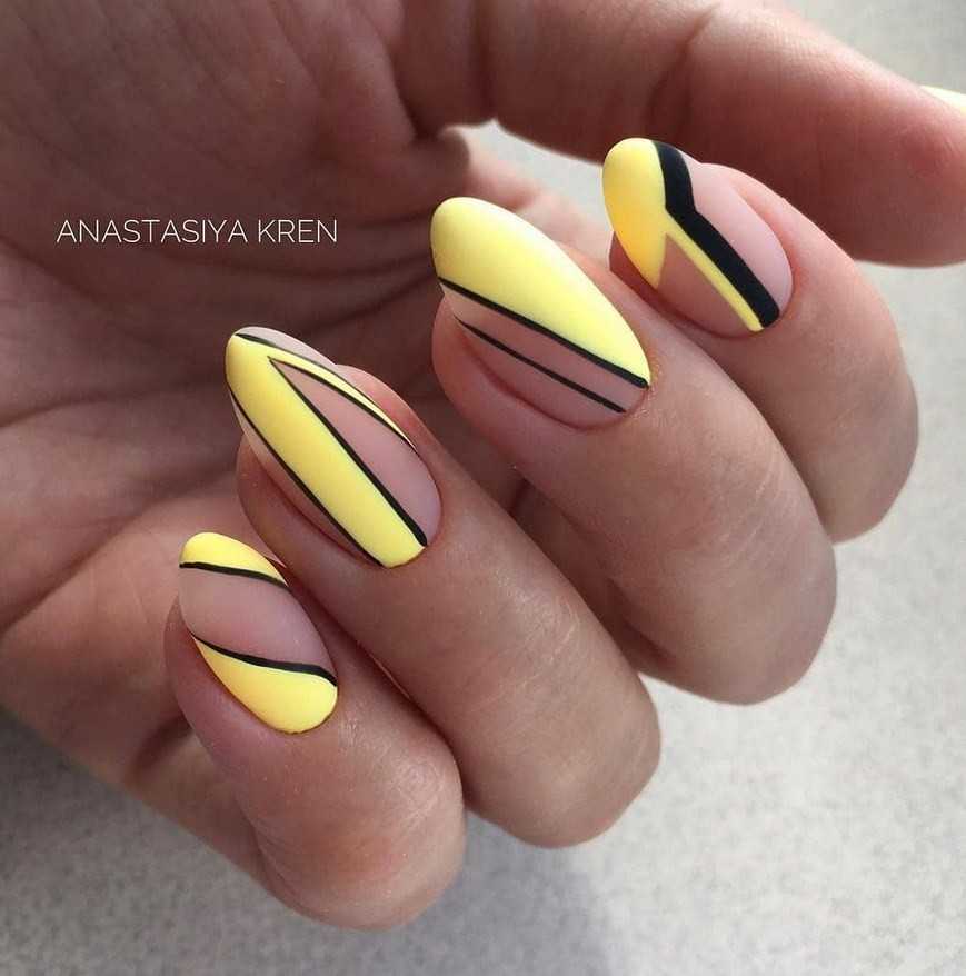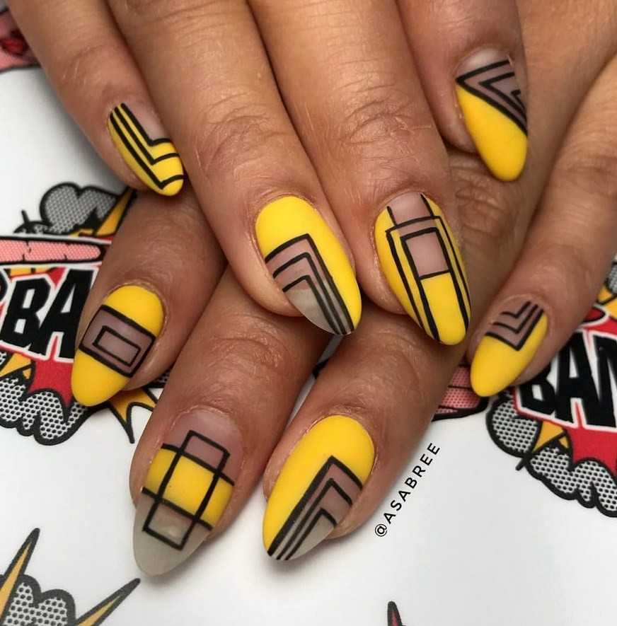 Солнечный оттенок хорошо сочетается с бежевым. Но минимализм здесь требуется буквально. Сделайте геометрию только на одном ногте. Этого достаточно для создания стильного и выразительного дизайна.