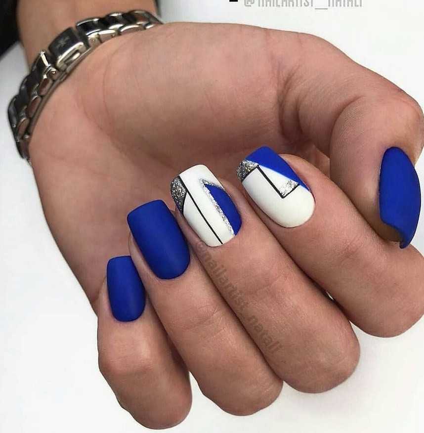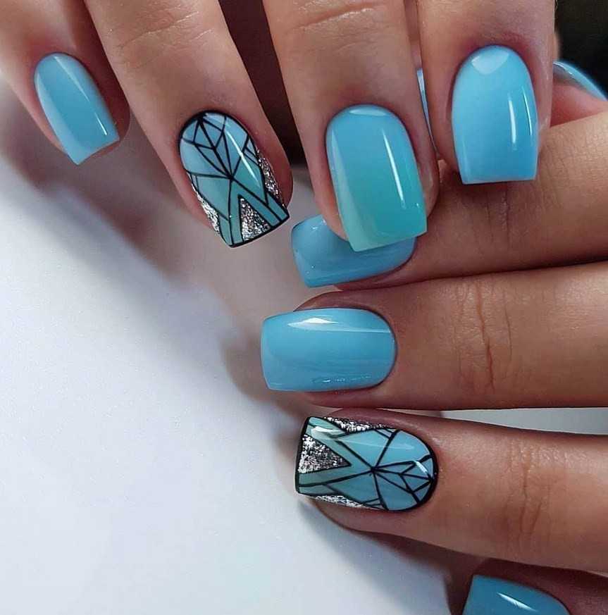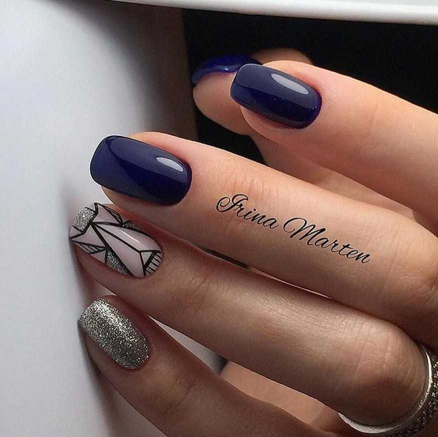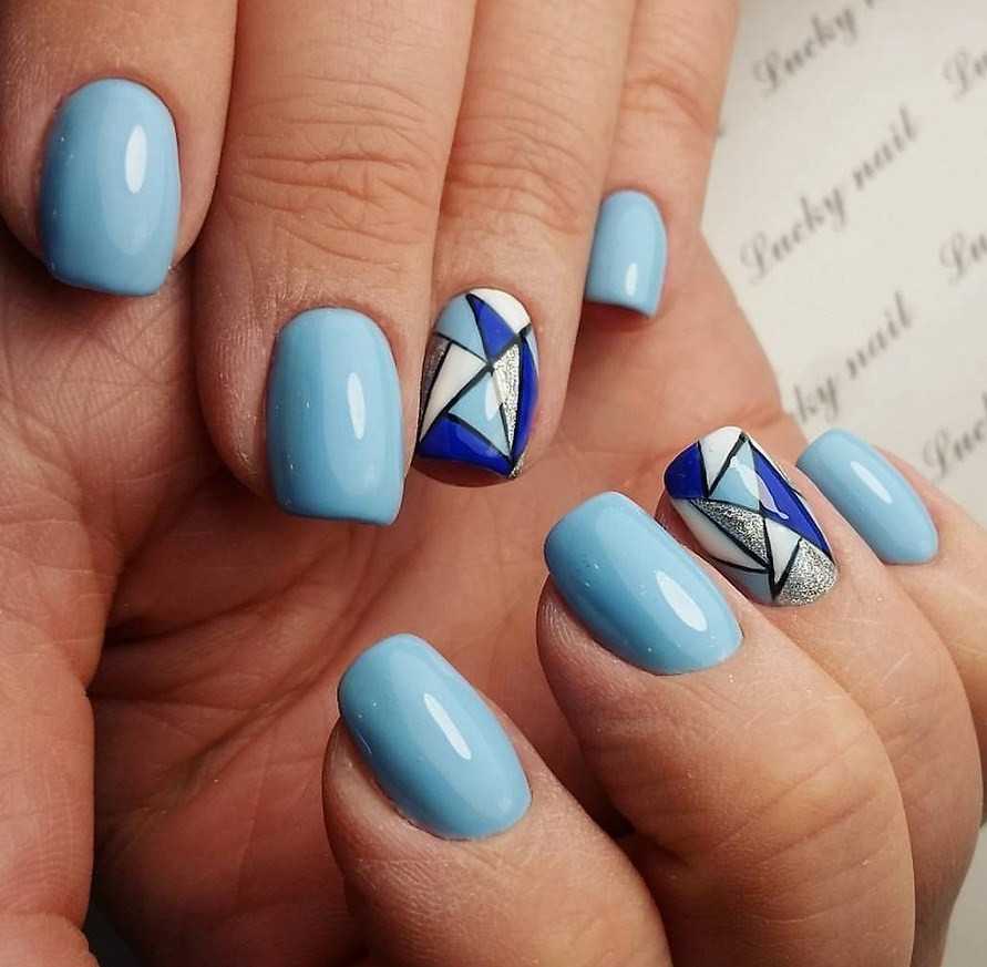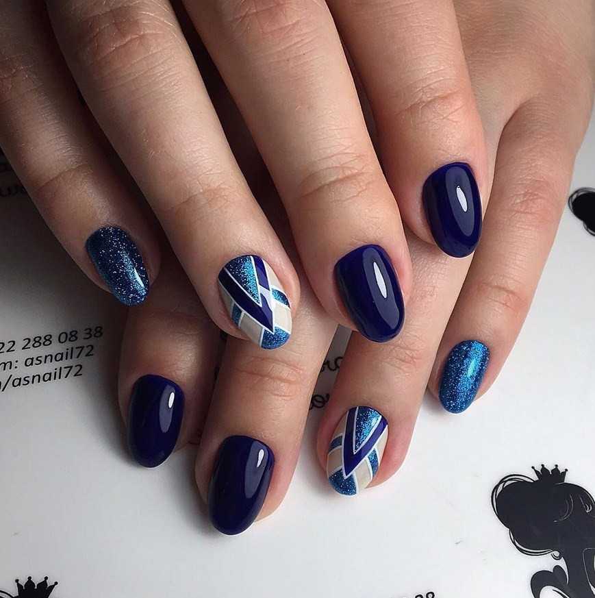 Бесподобный синий маникюр и оригинальные геометрические рисунки на нескольких ногтях