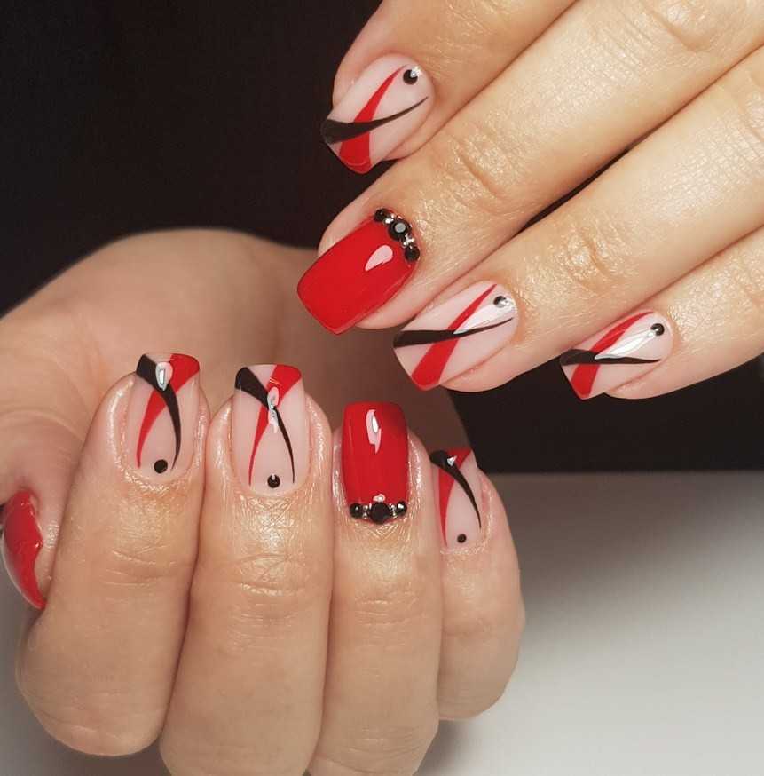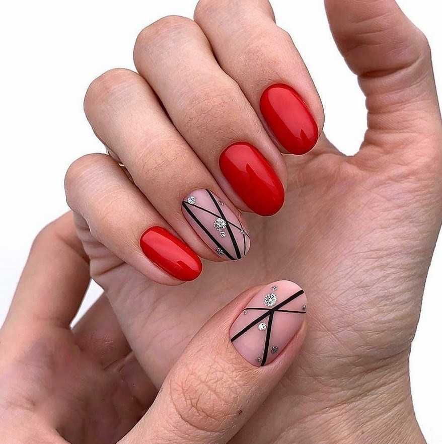 Красный цвет презентабелен и дерзок. Он же — хороший выбор для «негативного пространства». На красном хорошо смотрится асимметрия, нетривиальные фигуры, хаотичные линии. Если ногти небольшой длины, лучше изобразить на них абстракцию.