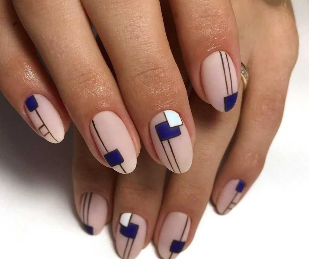 Контрастный геометрический рисунок на ногтях с применением белого, бежевого и синего лака смотрится потрясающе!