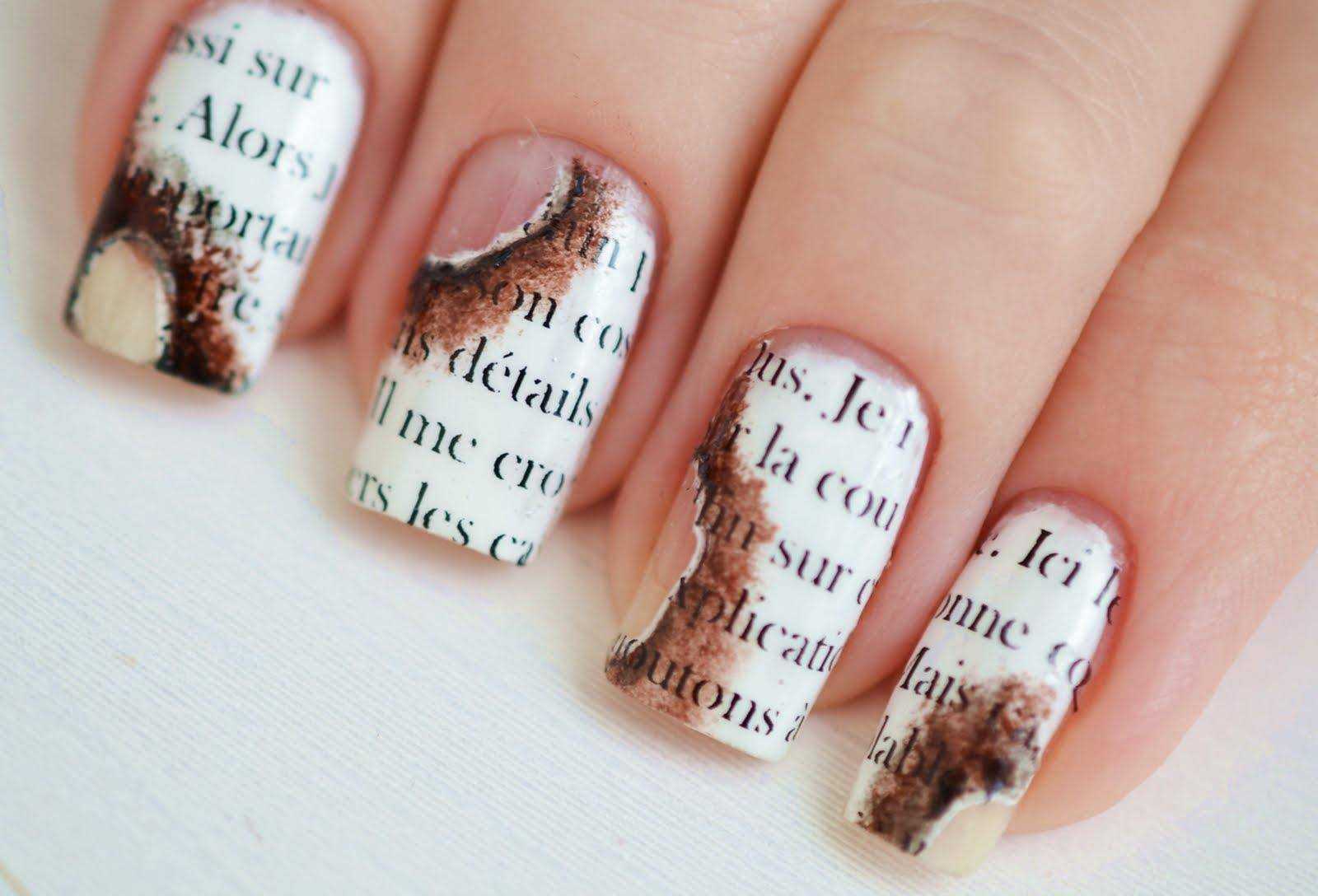 Второй, более бюджетный вариант – использовать простую газету. С ее помощью можно сделать оттиск с текстом или же нанести на ноготок небольшой отрезок. Такой маникюр сможет сделать даже новичок, но перед нанесением рекомендуем немного потренироваться.