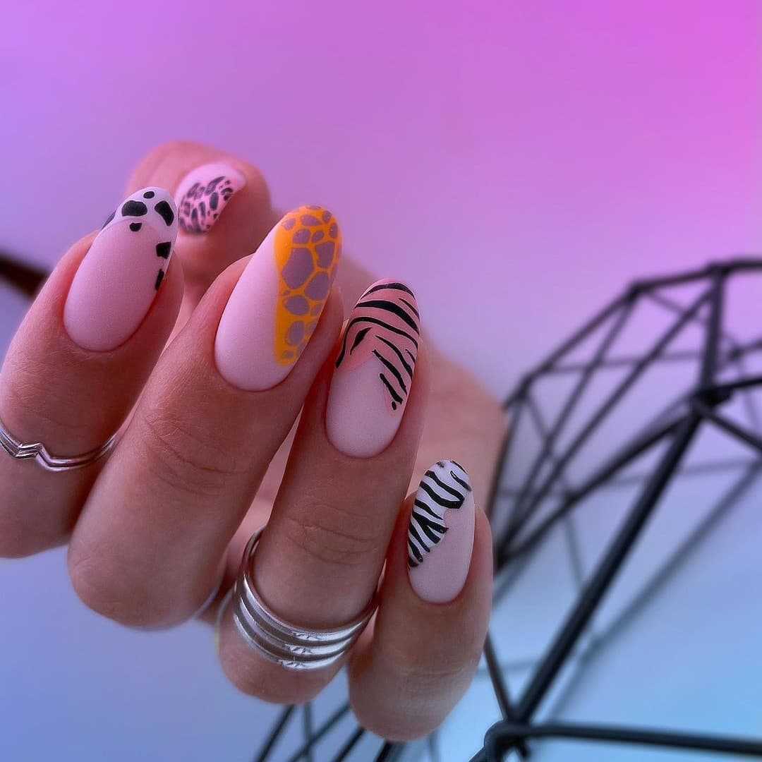 Имитация окраски животных имеет роскошный и дорогой вид, который очень привлекает внимание. Наиболее пользуются популярностью черно-белые полосы зебры, пятна леопарда или жирафа. В дополнение можно дополнить маникюр камнями, стразами или привлекательными блесками