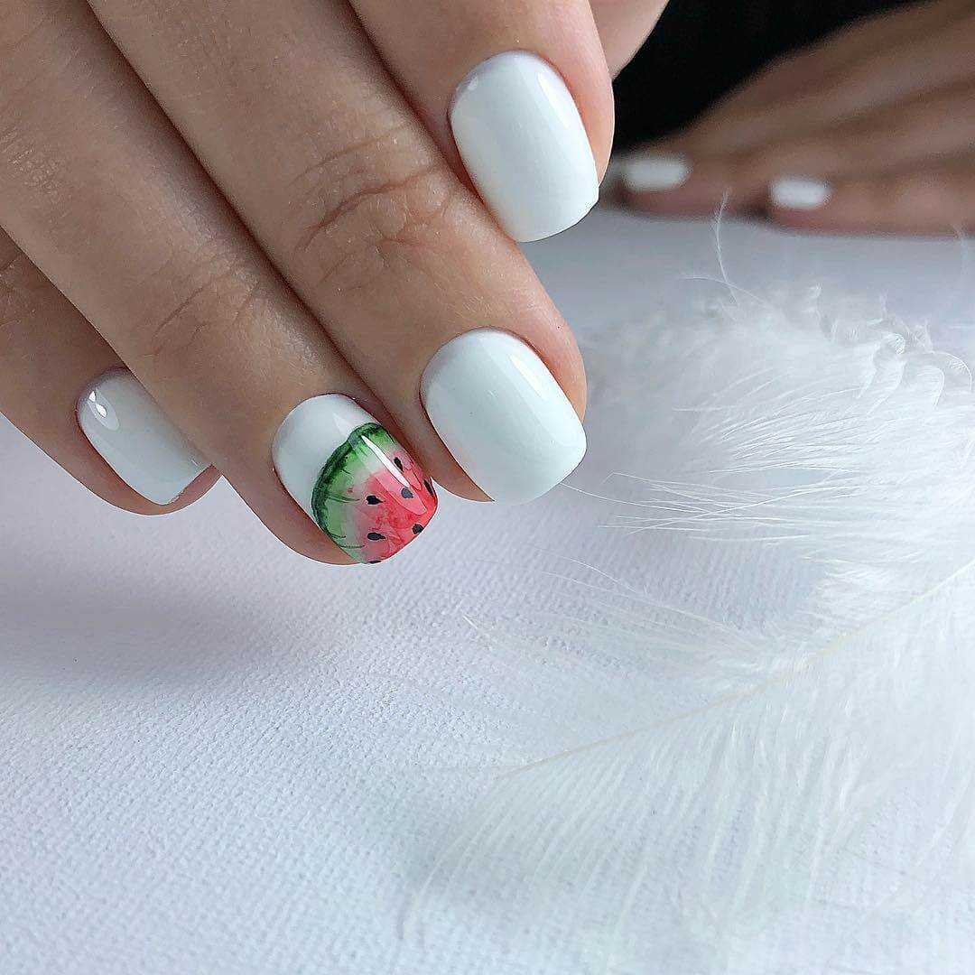 Маникюр с фруктами и ягодами в 2020 году может быть и в ярких сочных оттенках и пастельных, чаще всего изображают именно фрукт в разрезе. Рисунок желательно рисовать от руки, именно благодаря ручной росписи, дизайн смотрится добротно и красиво. Если нет возможности нарисовать рисунок, то можно использовать стемпинг и слайды.