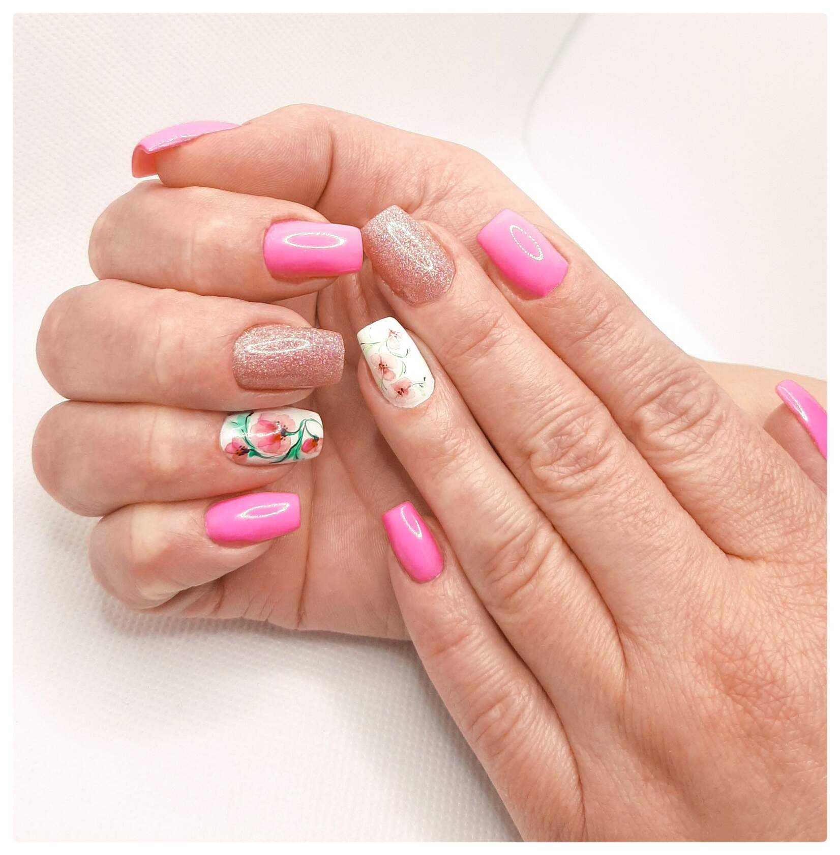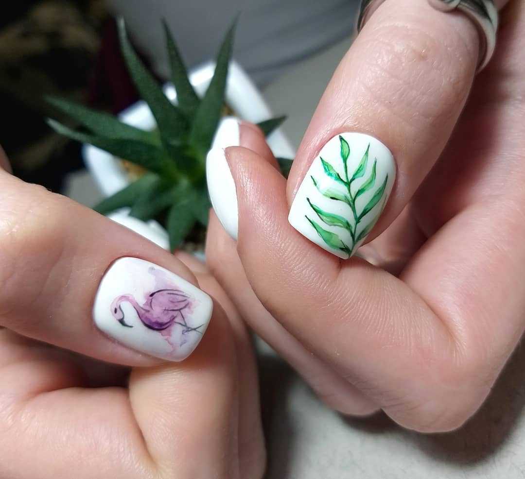 Рисунок акварелью в виде цветов и других флористических мотивов будет мust нave в летнем маникюре сезона 2020. Цветочный рисунок может быть в стиле минимализм (простой и маленький в виде акцента), а может быть и целая роспись на ногтях. Также в виде росписи акварелью очень красиво смотрятся бабочки, птички, которые тоже можно изобразить в летнем маникюре.