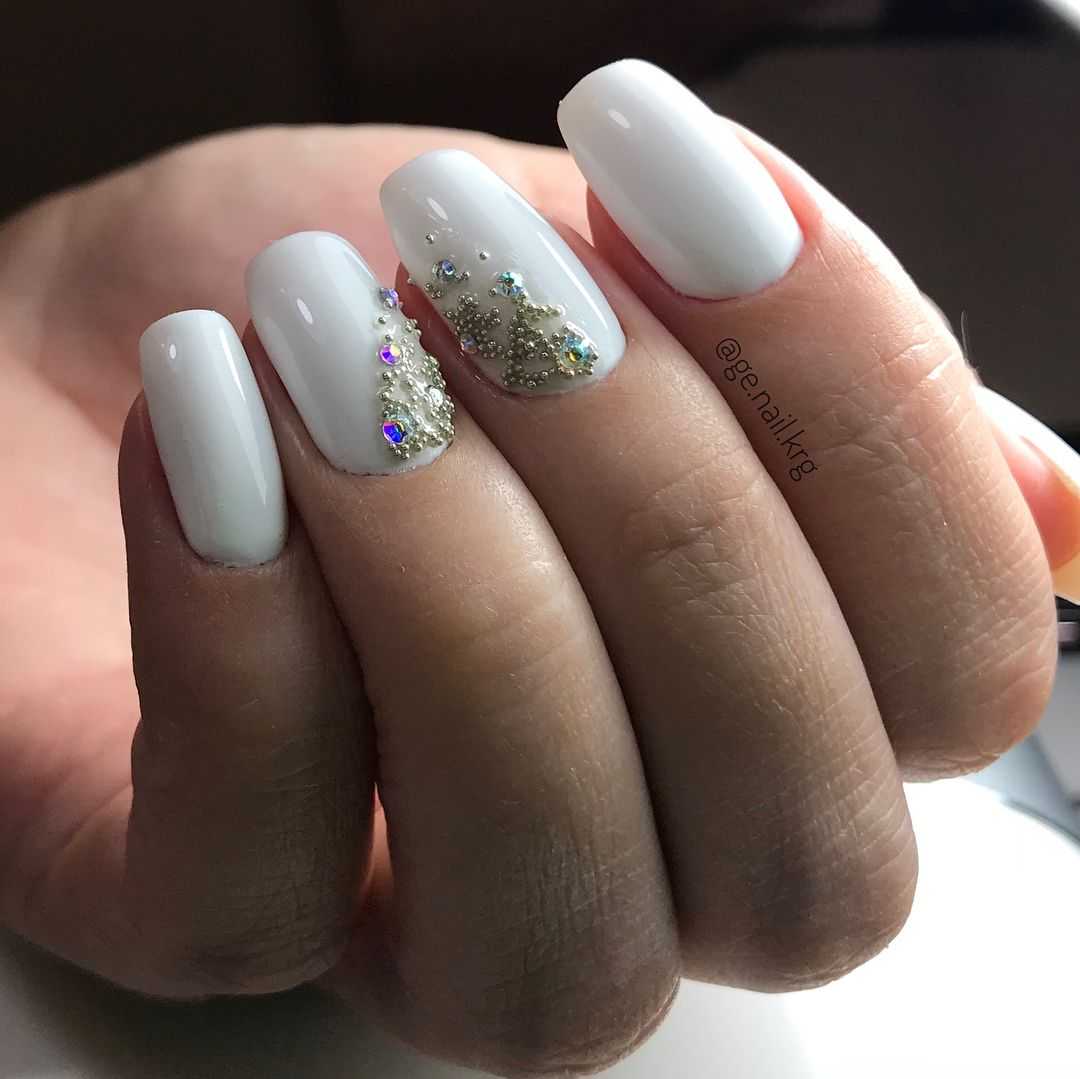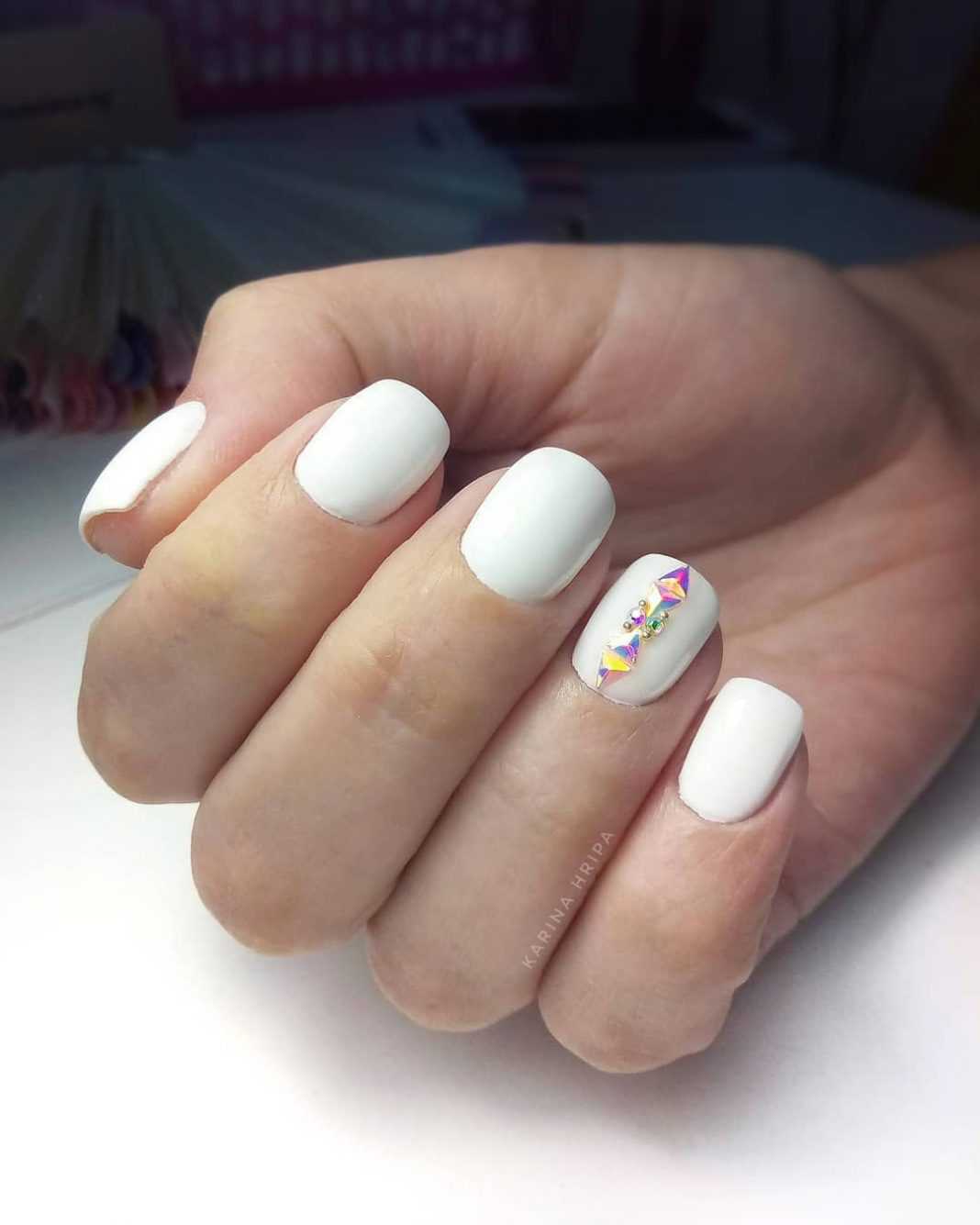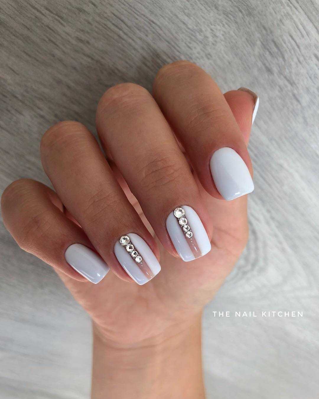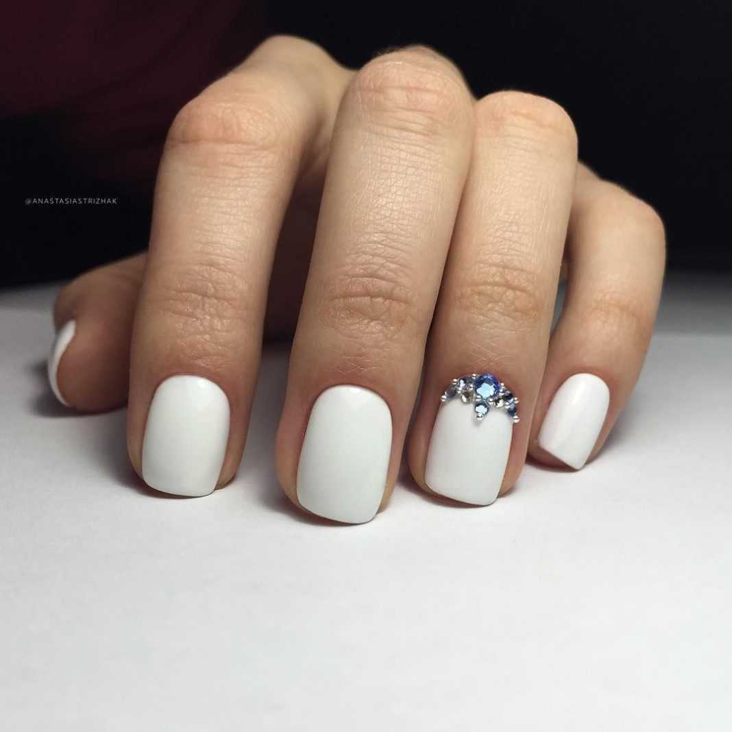 В летнем маникюре стразы смотрятся по-особенному изящно привлекательно. Для коротких ноготков можно применять не только выкладку камешков у кутикулы ногтевой пластины. Тренды лета 2020 предлагают выполнение узора на ноготках. Например, для морского отдыха актуальным станет рисунок из стразов в виде морской звезды, черепахи и других морских мотивов. Для летнего дизайна прекрасным решением станет украшение одного ноготка цветными или серебристыми камешками. Можете смело использовать декор не только привычной круглой формы, но и ромбовидной, звездообразной, конусной и других. Среди популярного и распространенного нейл-арта на коротких ноготках со стразами можно выделить дизайн с мерцающей короной.