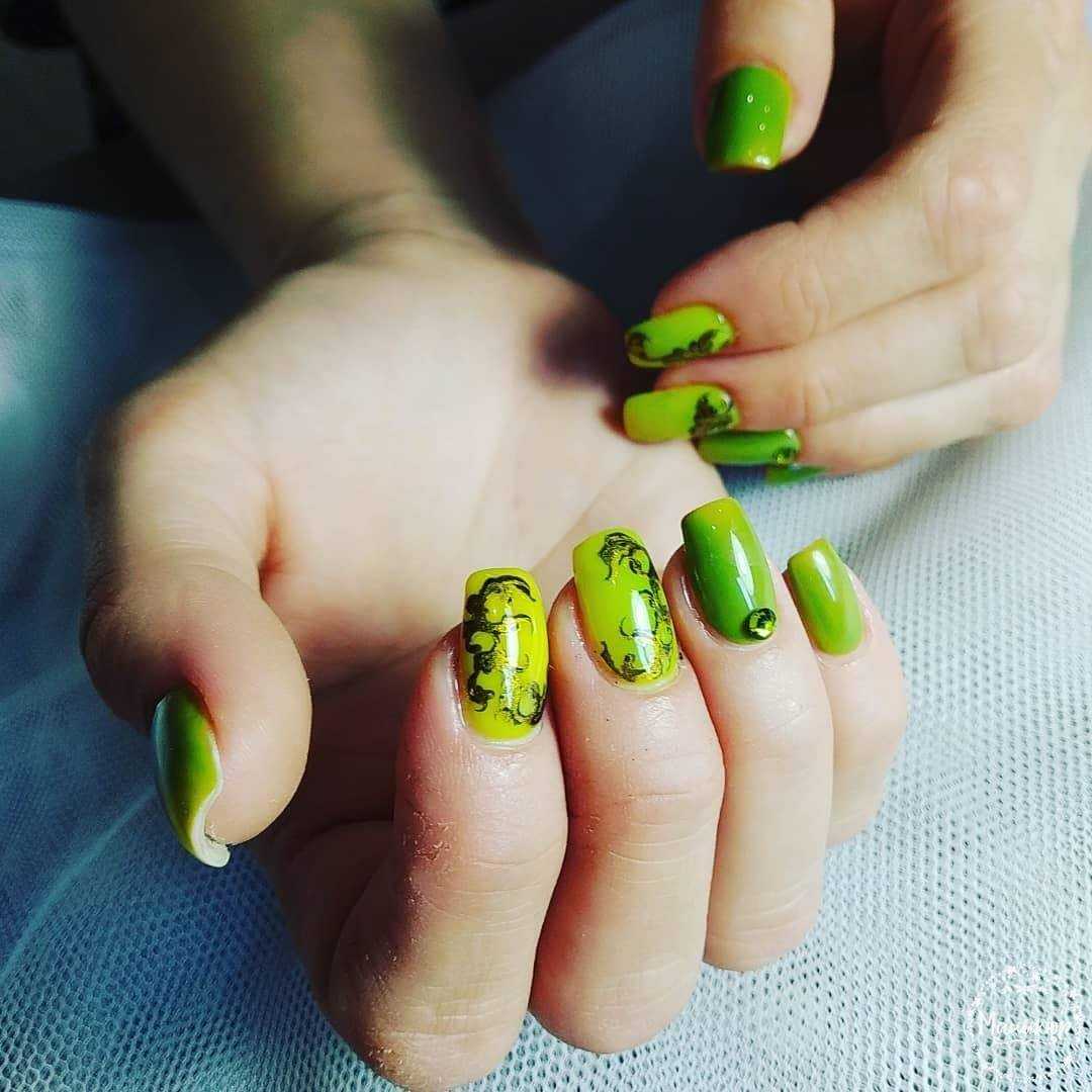 Мраморный дизайн можно выполнить также в розовом, изумрудном, черном цвете. В этих оттенках мрамор также выглядит очень благородно и сдержанно. Чтобы мраморный дизайн не выглядел банально и плоско, дополните его фольгированными серебряными полосками, глиттером или другим блестящим декором.