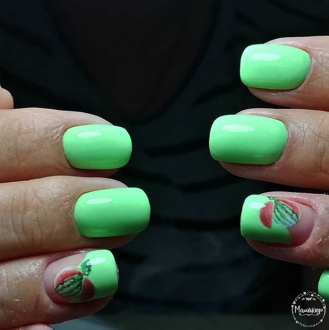 В тренде летний маникюр с клубникой, арбузом, малиной, ананасом, бананом, киви, авокадо и даже с изображением апельсина и лимона.
