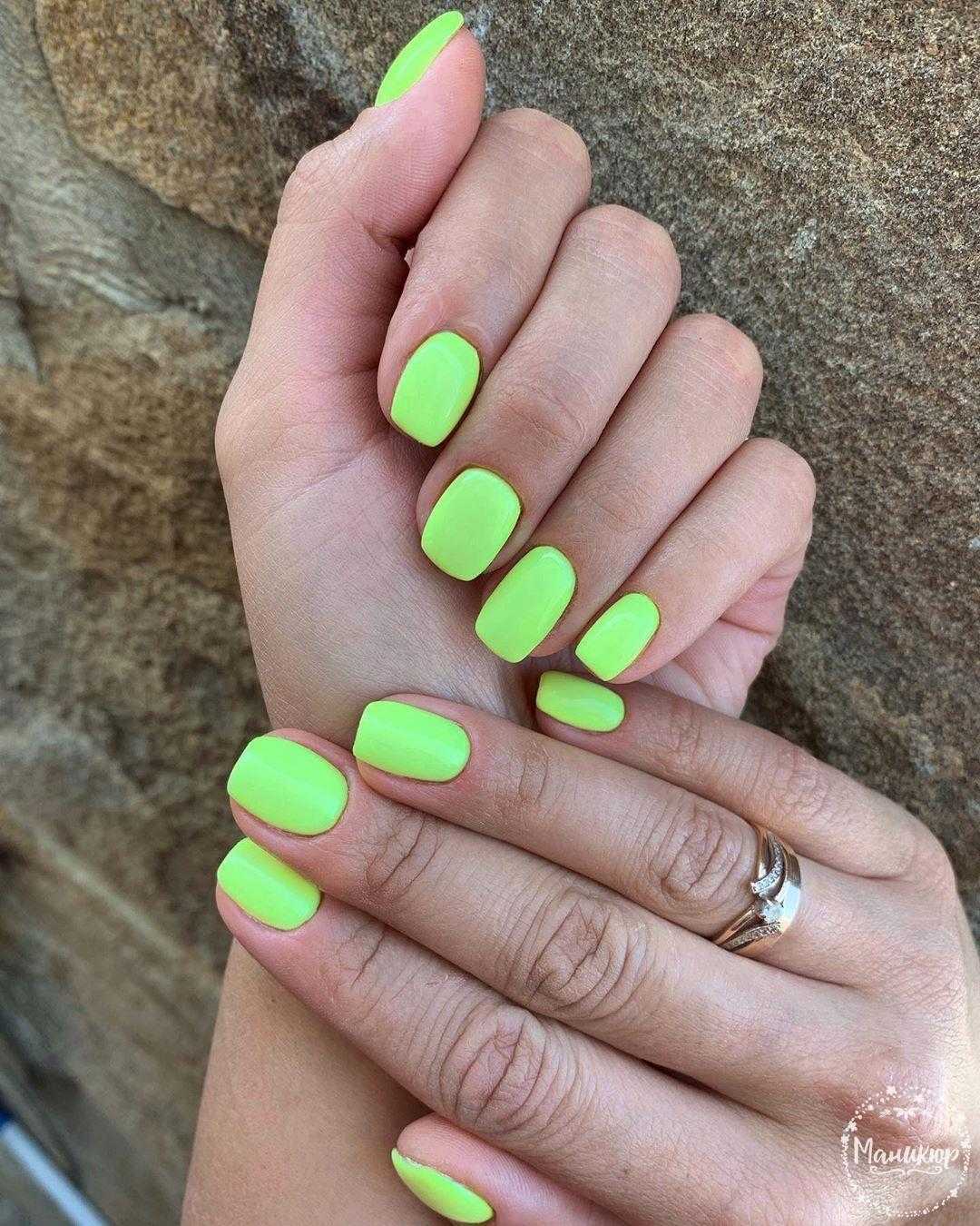 для летнего периода подойдут яркие оттенки: салатовый, желтый, розовый, фиолетовый, можно разнообразить однотонное покрытие при помощи дизайна на 1-2 ногтях;