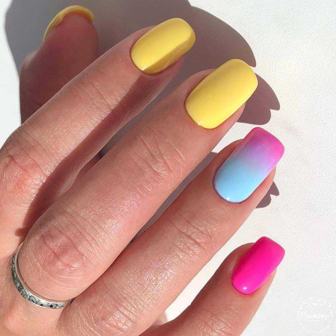 Несомненно, в летнем сезоне не обойтись без ярких красок, в том числе для коротких ногтей. Тем более, что каждая модница стремится попробовать для себя что-то интересное и необычное. Рекомендуем сделать градиент хотя бы на нескольких ноготках. Это универсальное оформление, благодаря чему не придется волноваться в процессе выбора образа летом. Ведь все яркие оттенки будут хорошо смотреться с маникюром.