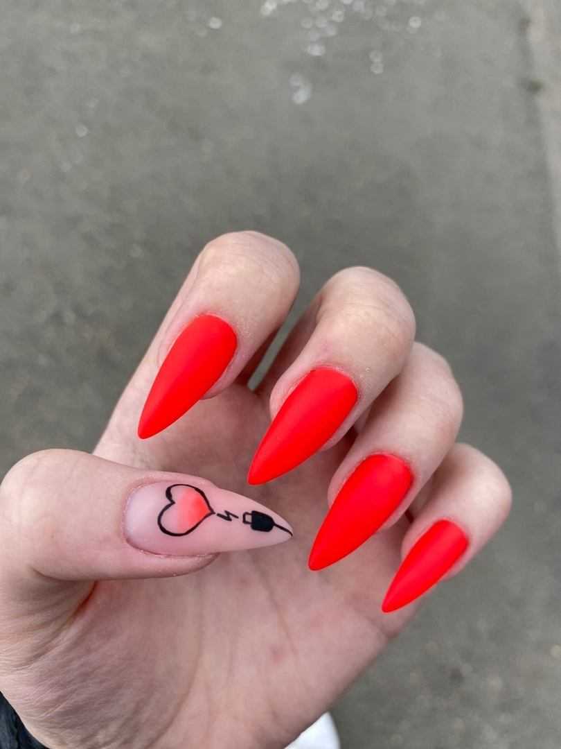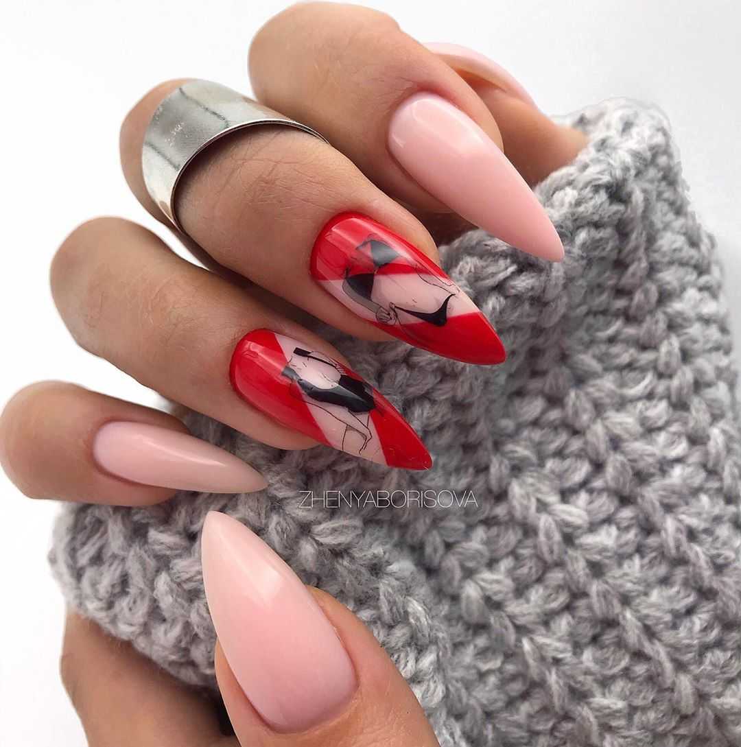 Красный маникюр на острые ногти выглядит шикарно. Понятно, что такая дама выделяется из толпы