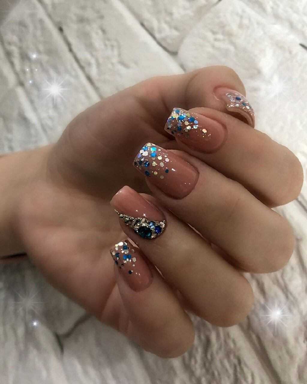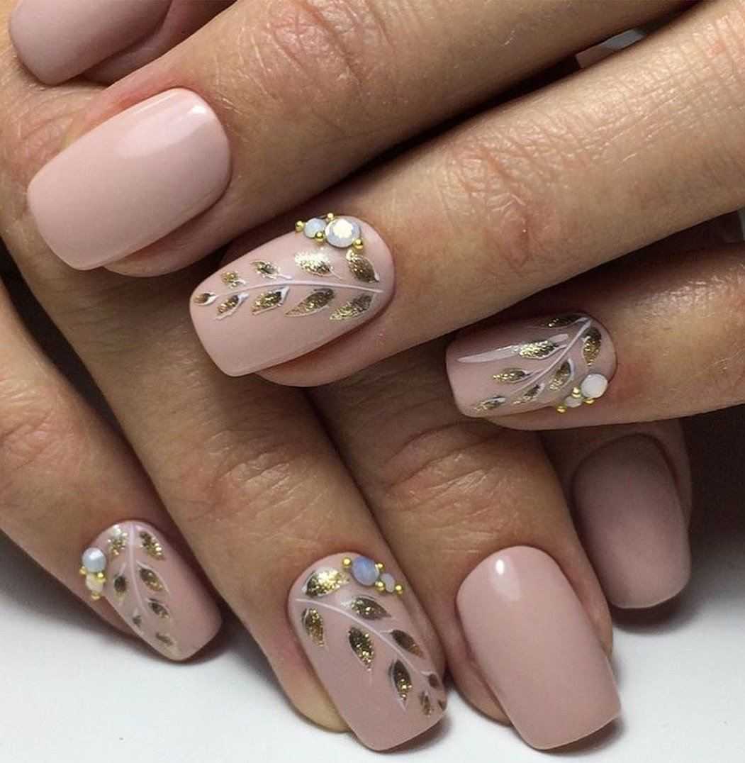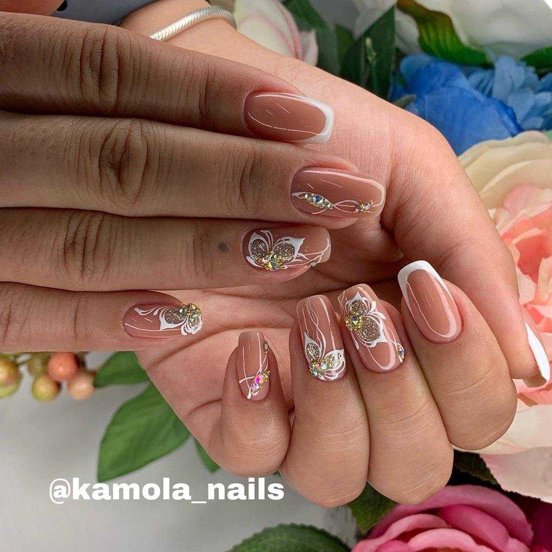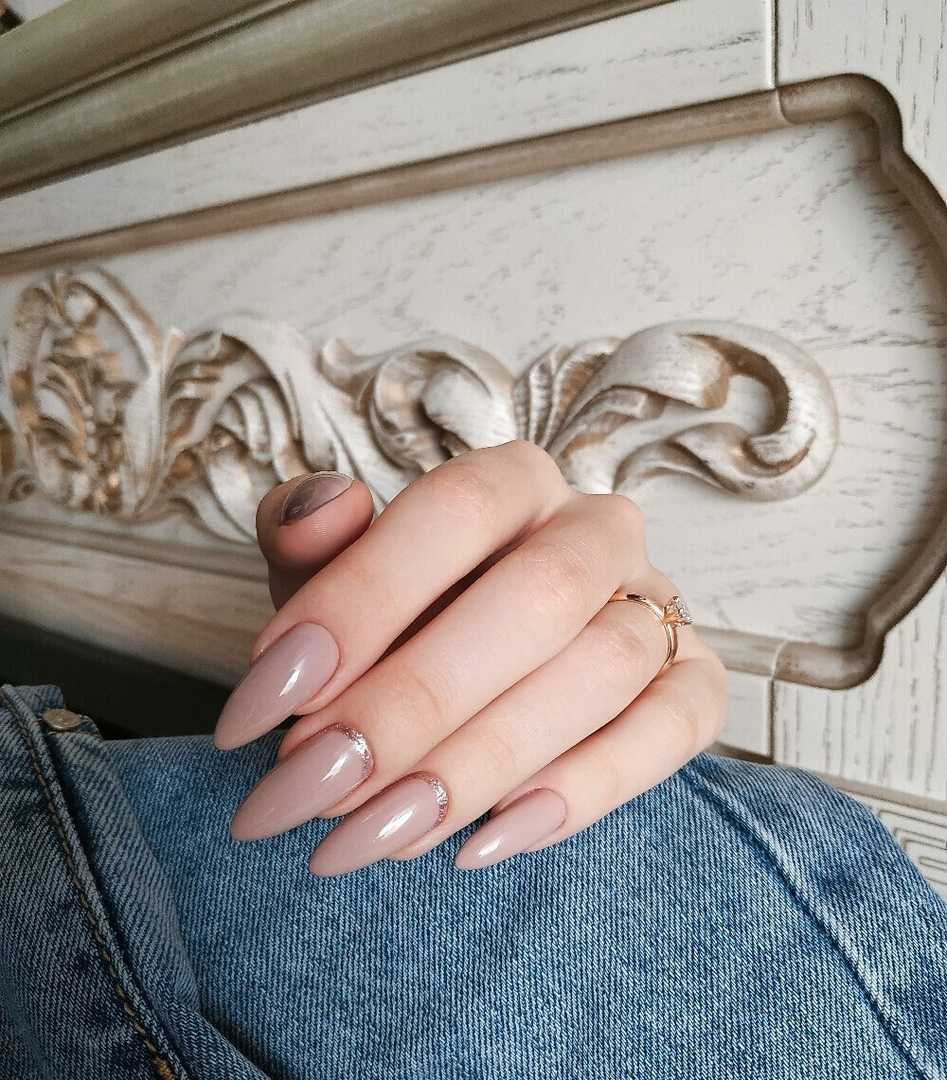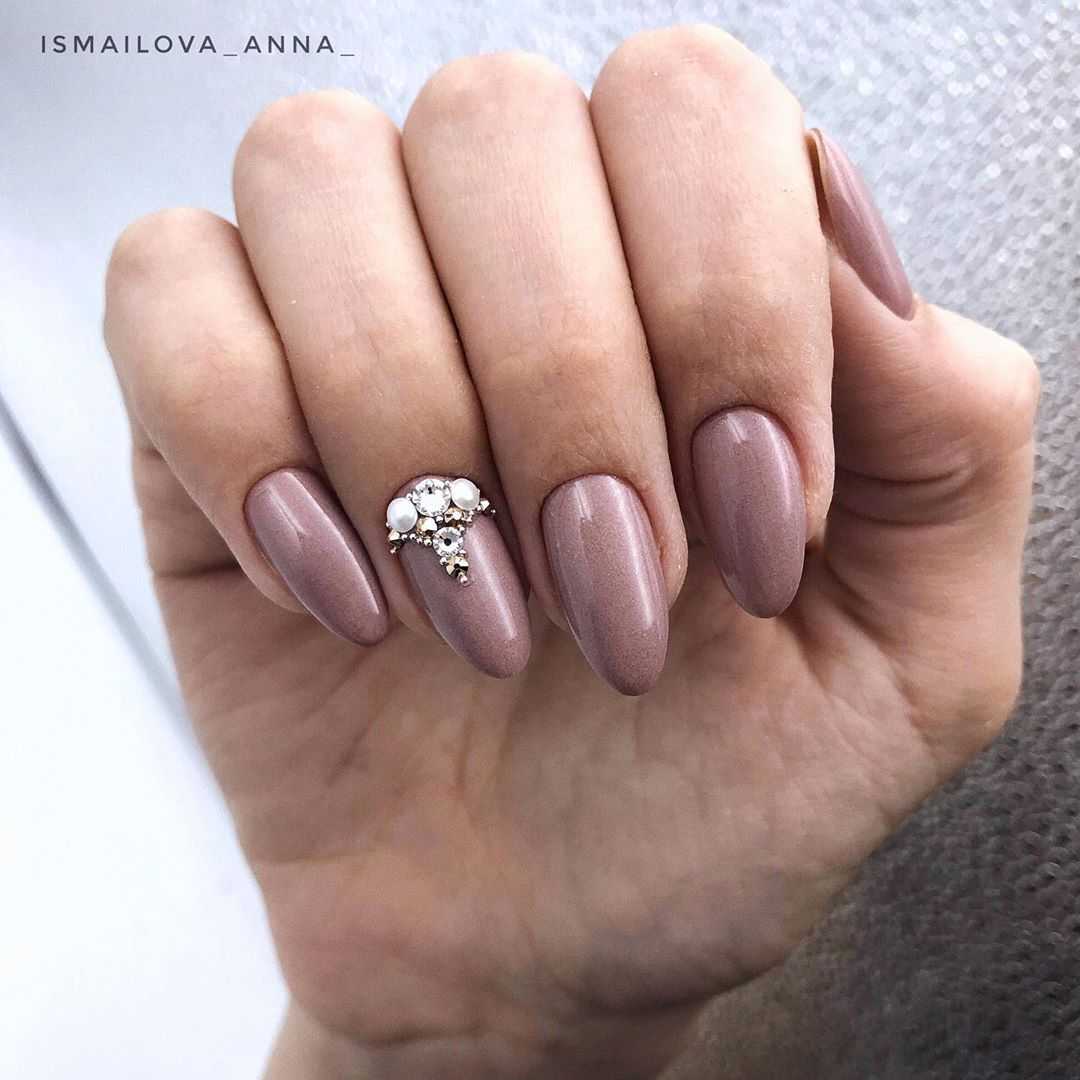 Изысканно смотрится нюдовый маникюр в сочетании со стразами, блестками или другим декором. Те, кто не привык к броскому оформлению, могут прибегнуть к блестящему напылению, приближенному к оттенку лака.