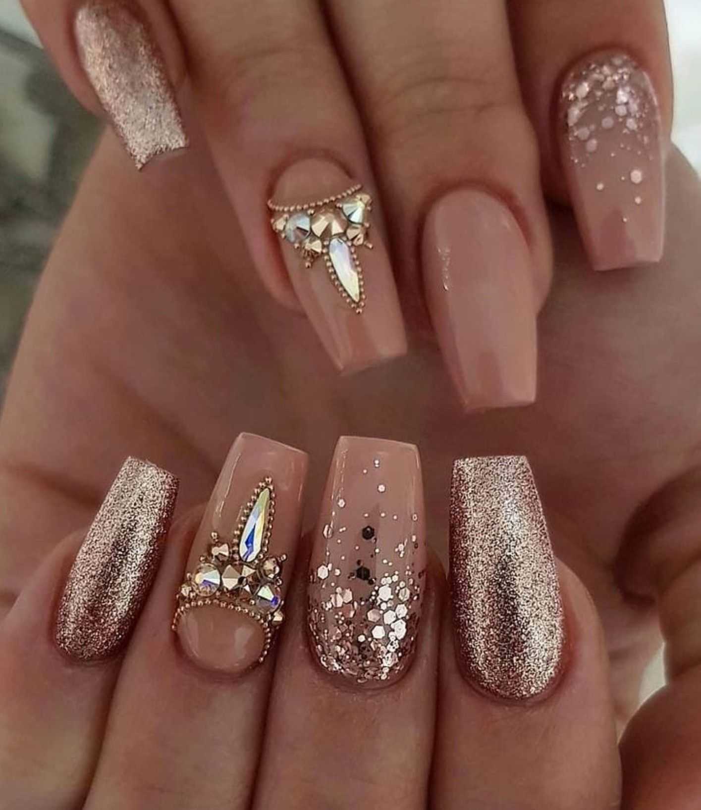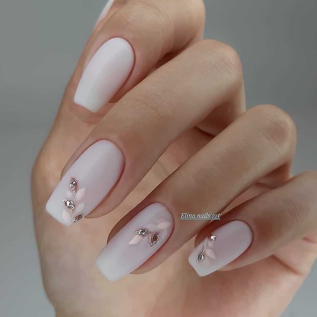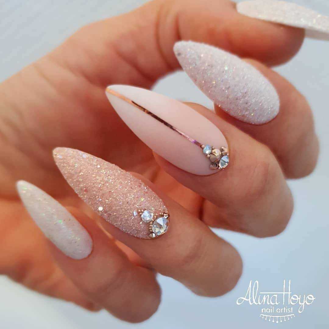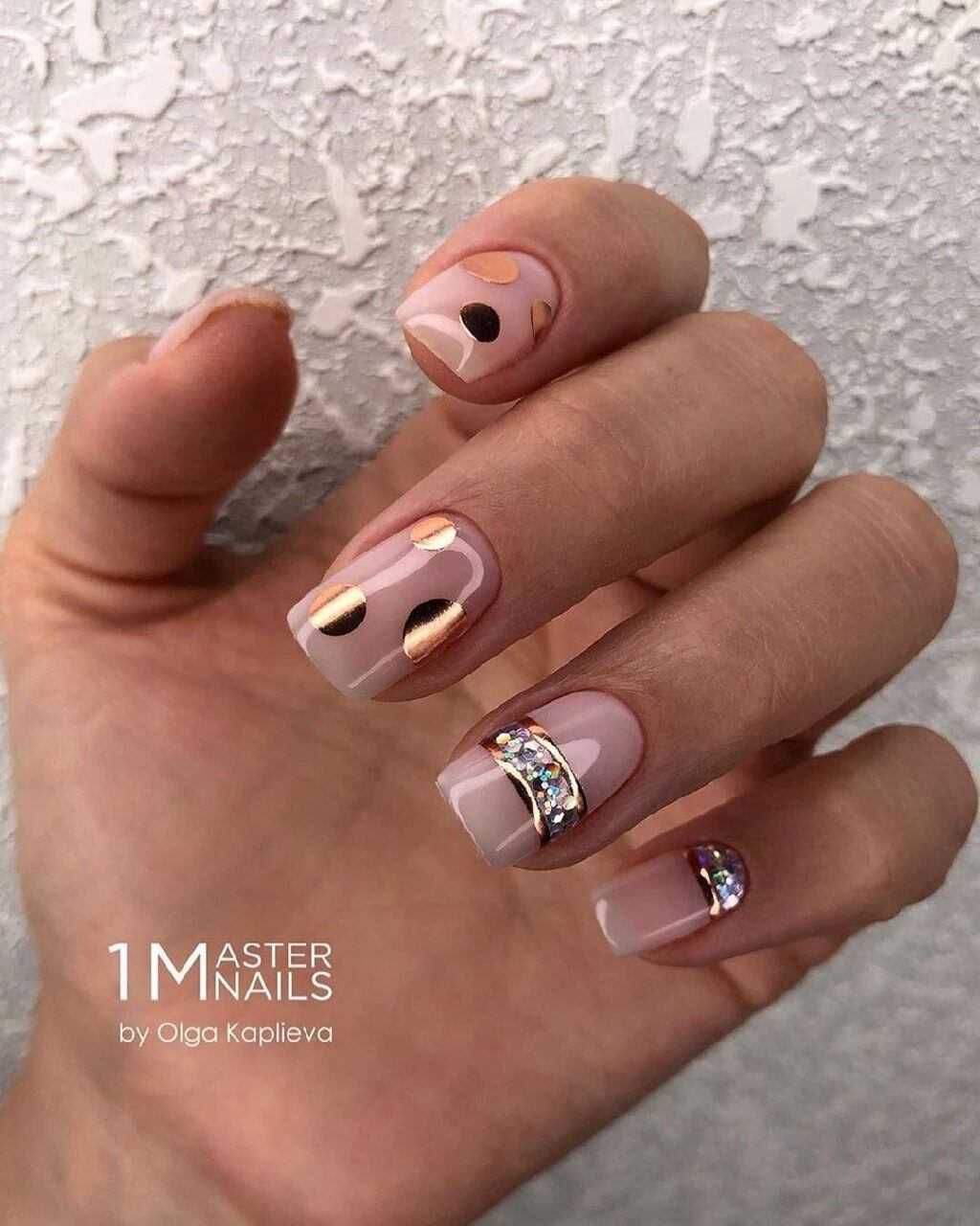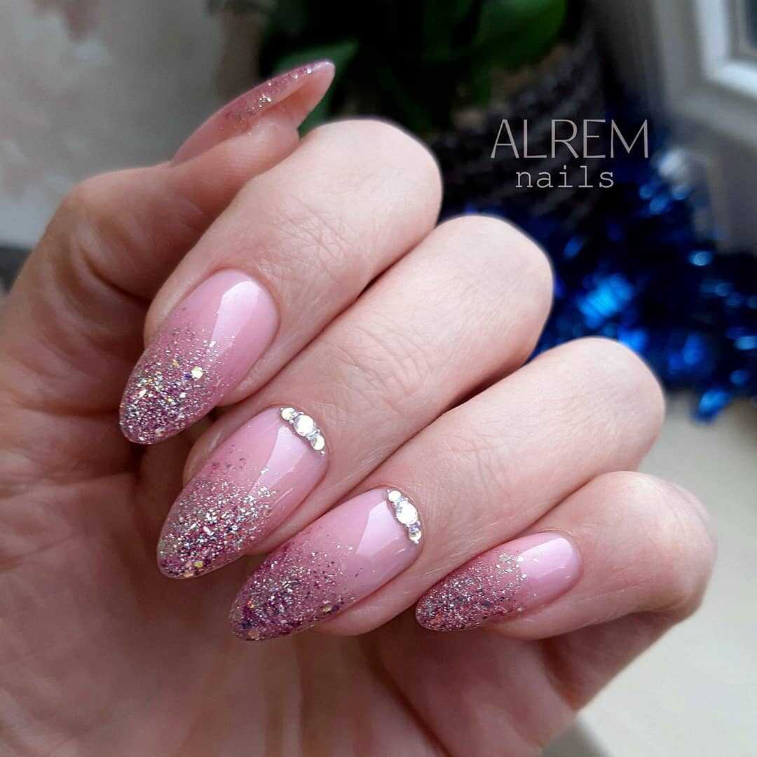 Изысканно смотрится нюдовый маникюр в сочетании со стразами, блестками или другим декором. Те, кто не привык к броскому оформлению, могут прибегнуть к блестящему напылению, приближенному к оттенку лака.