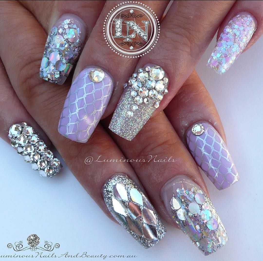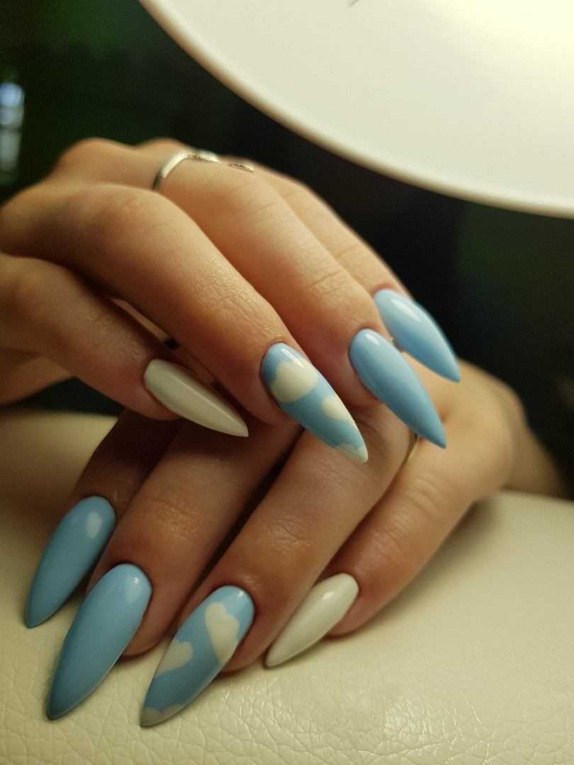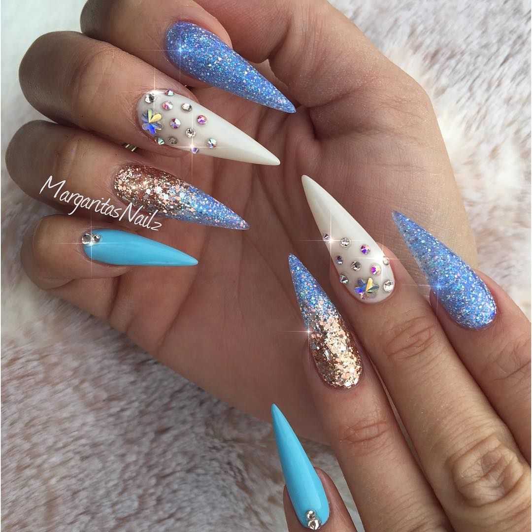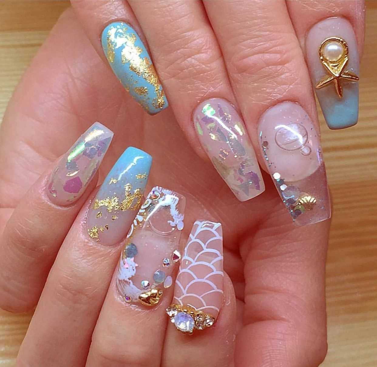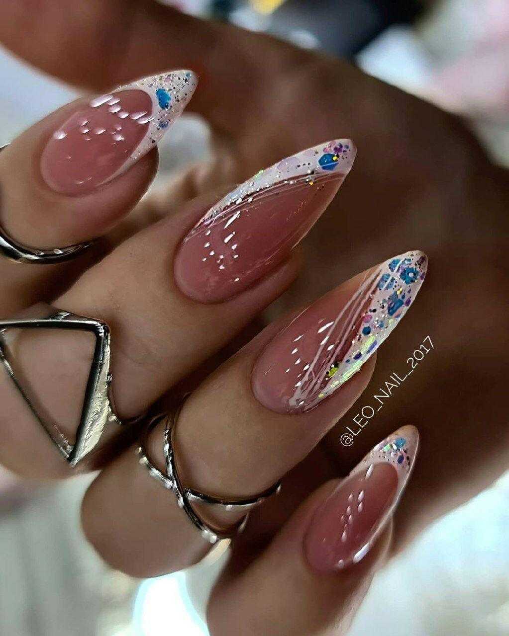 Аквариумный маникюр с фольгой на длинных острых ногтях