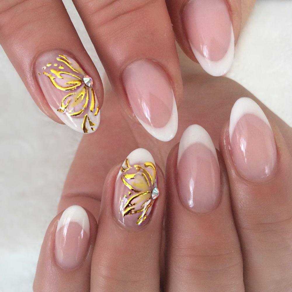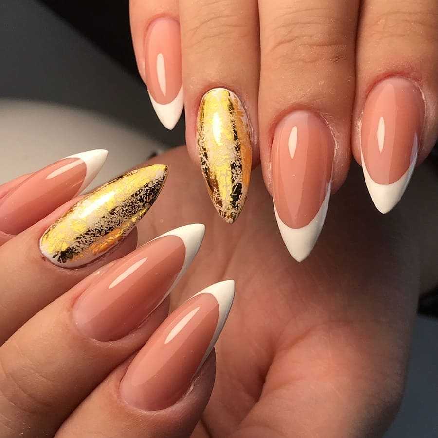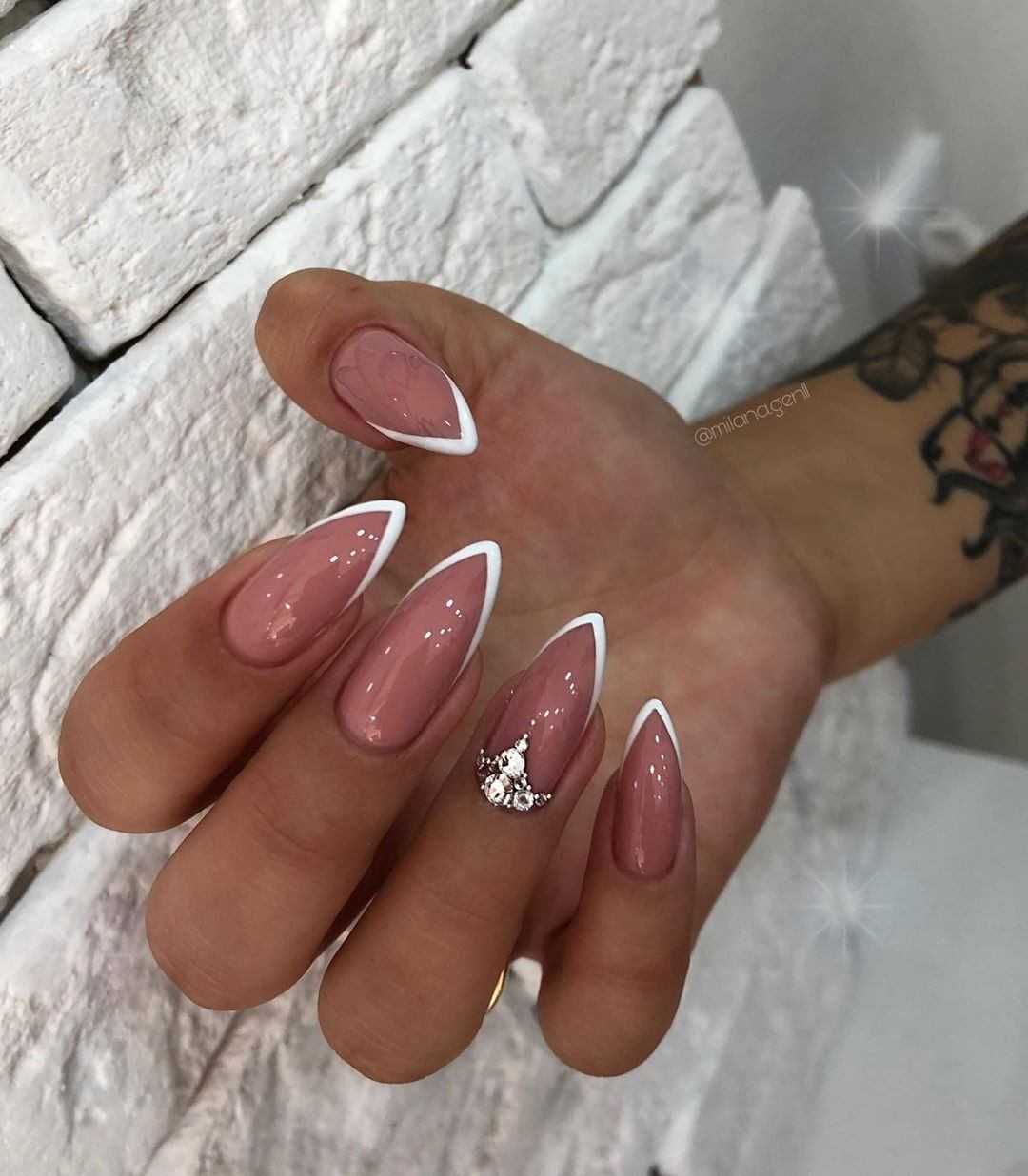 Классический френч приобретает на острых ногтях новое воплощение. Вы можете экспериментировать с вариантами привычного французского дизайна, не боясь переборщить. Самыми стильными идеями будут утолщение улыбки, ее различное положение и форма, добавление узоров и рисунков.