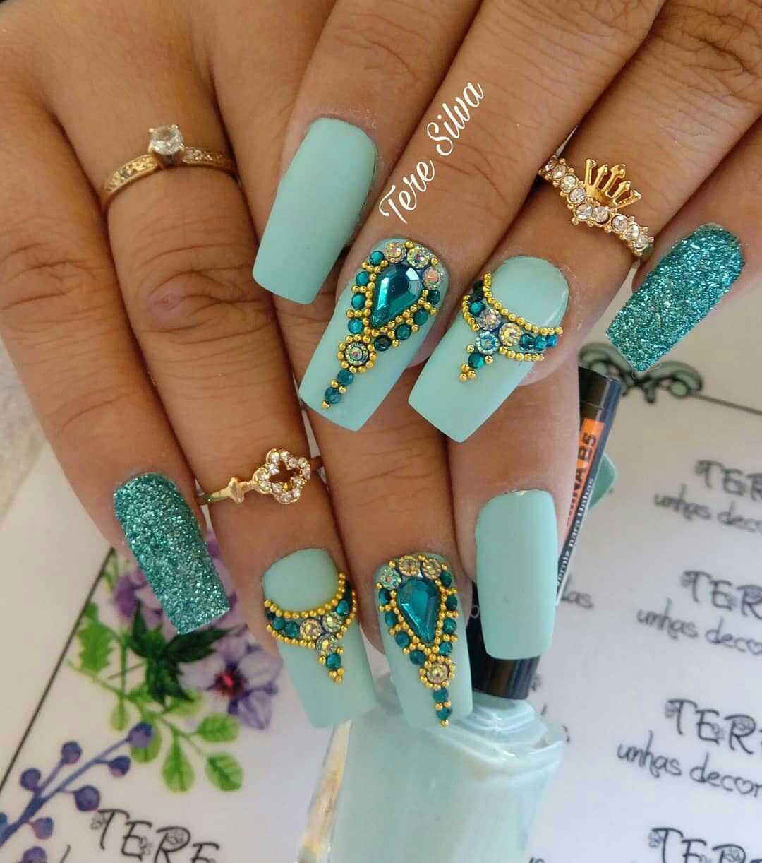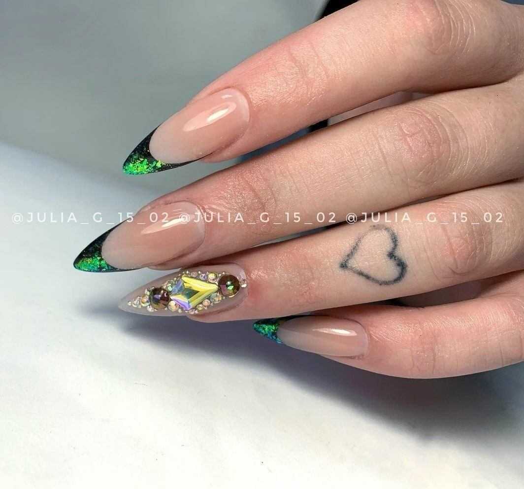 Чтобы сделать зелёный дизайн ногтей вечерним, добавьте на ноготь выкладку из страз. В сочетании с оттенками neon или салатовым камни смотрятся странно, но глубокие изумрудные или пастельные тона стильные кристаллы только преобразят.