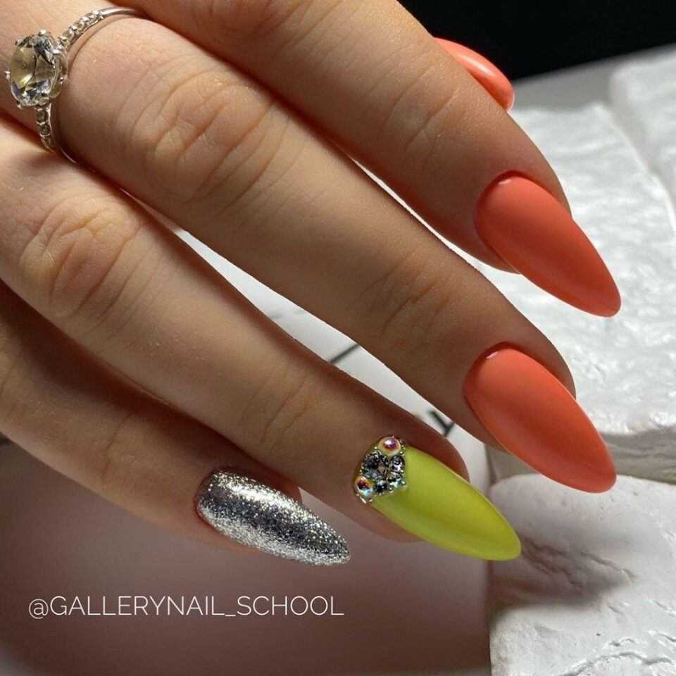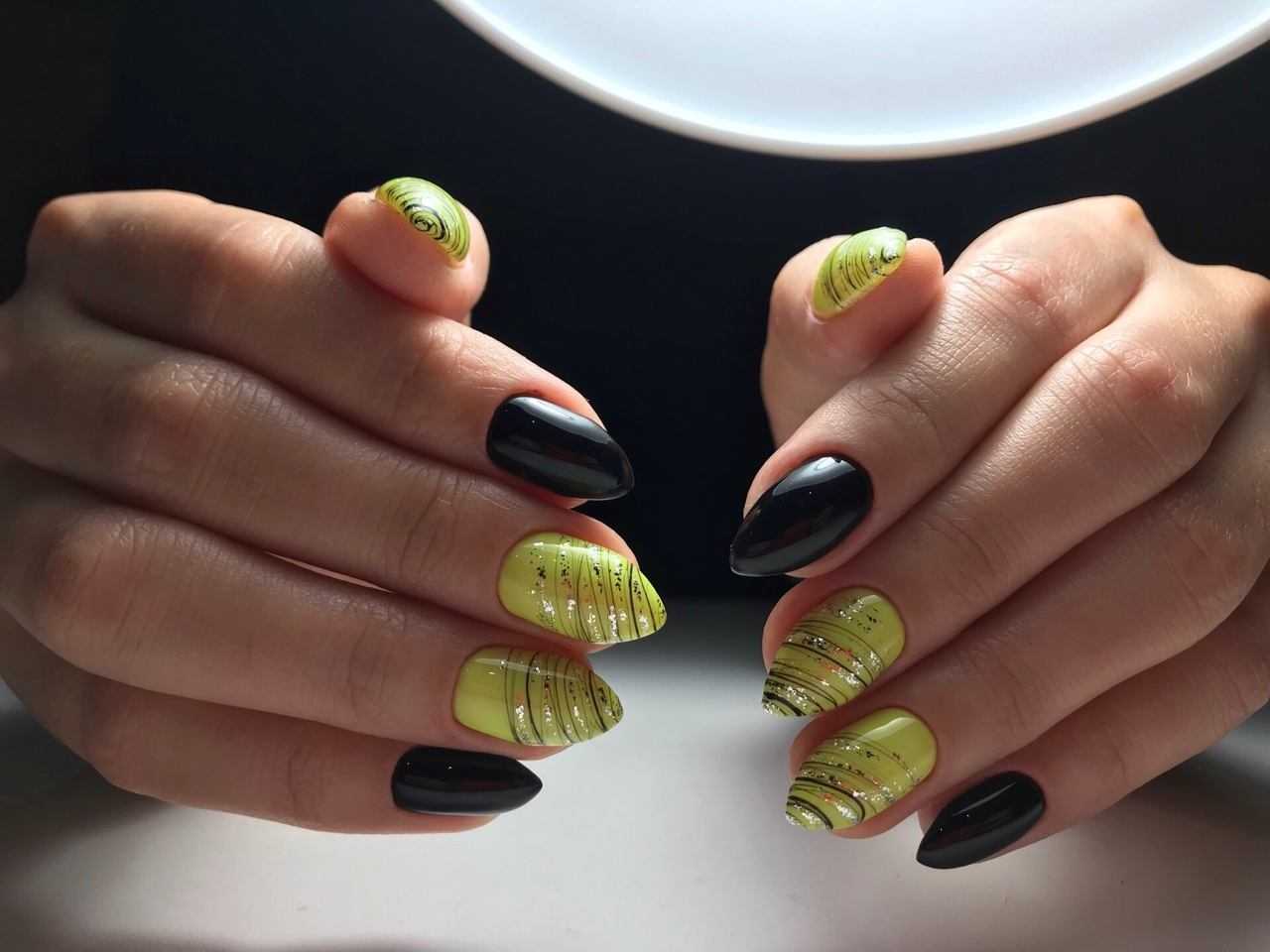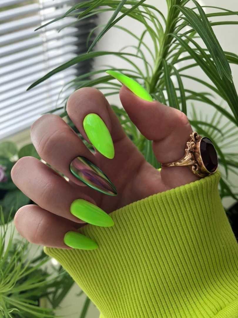 На фотографиях актуальные дизайны стильно смотрятся со всеми оттенками: от салатовых и неоновых до благородно-изумрудных. На лето особенно актуальны цвет молодой травы и нежный приглушённый ментол.