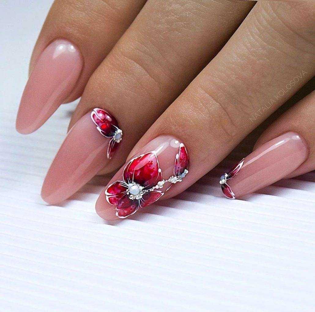 Среди новинок идей с цветочными и растительными принтами наиболее актуальными мастера называют реалистичные объёмные рисунки. Чтобы повторить стильный маникюр, возьмите: