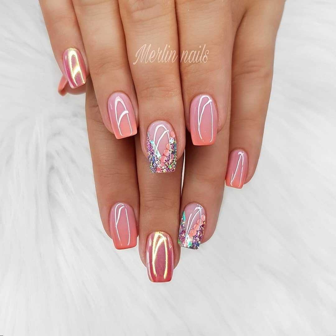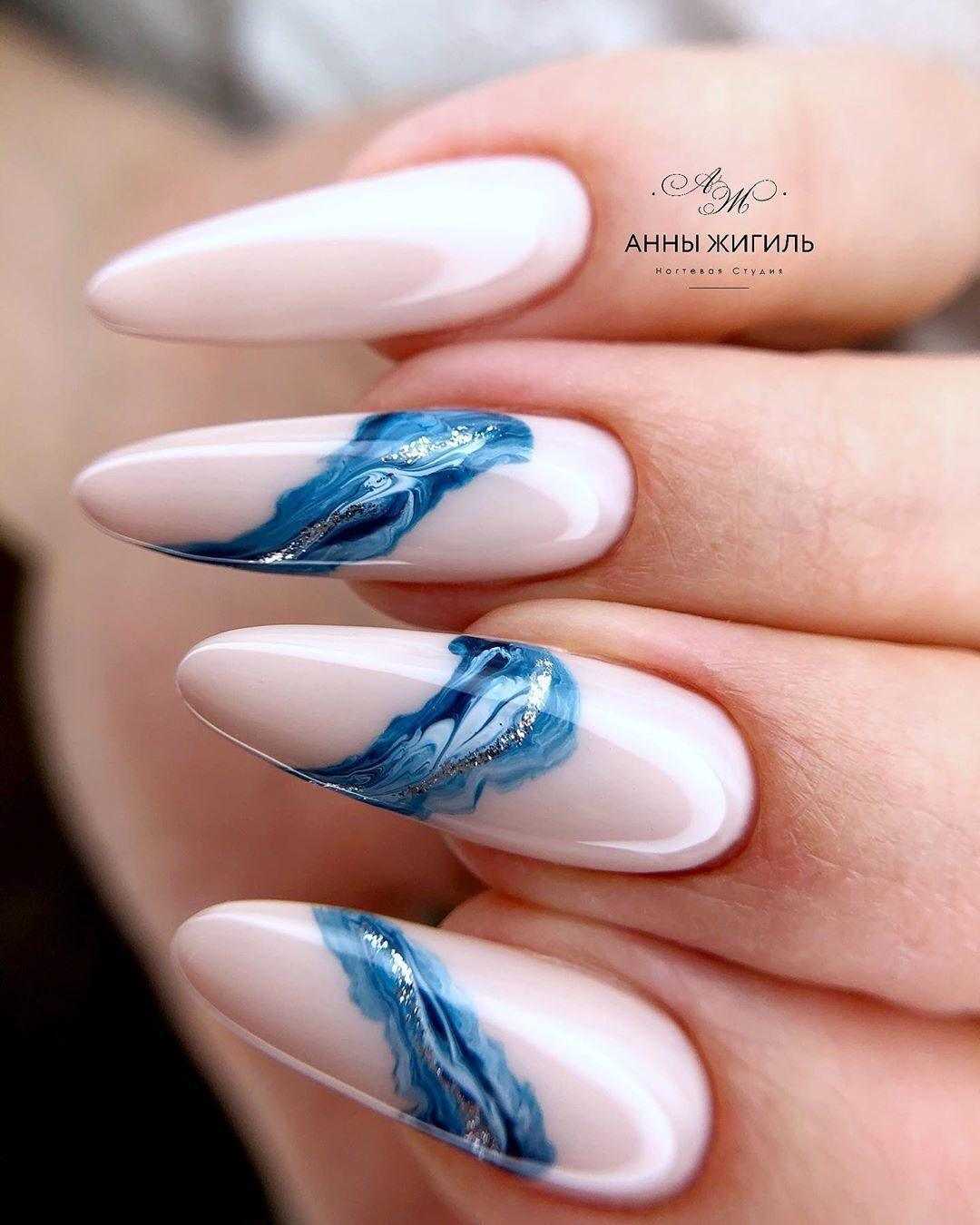 В 2022 тенденции предлагают украшать блёстками всю поверхность ногтя или части в виде лунок, полосок в середине пластины и на свободном крае. Актуальны и мраморные текстуры с сочетанием цветов. Чтобы повторить стильный дизайн, возьмите: