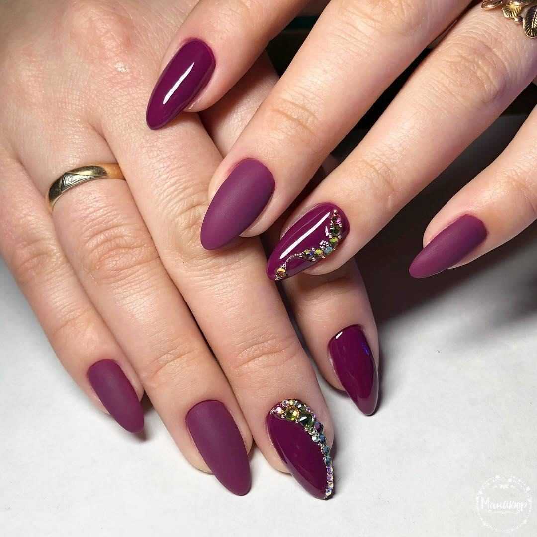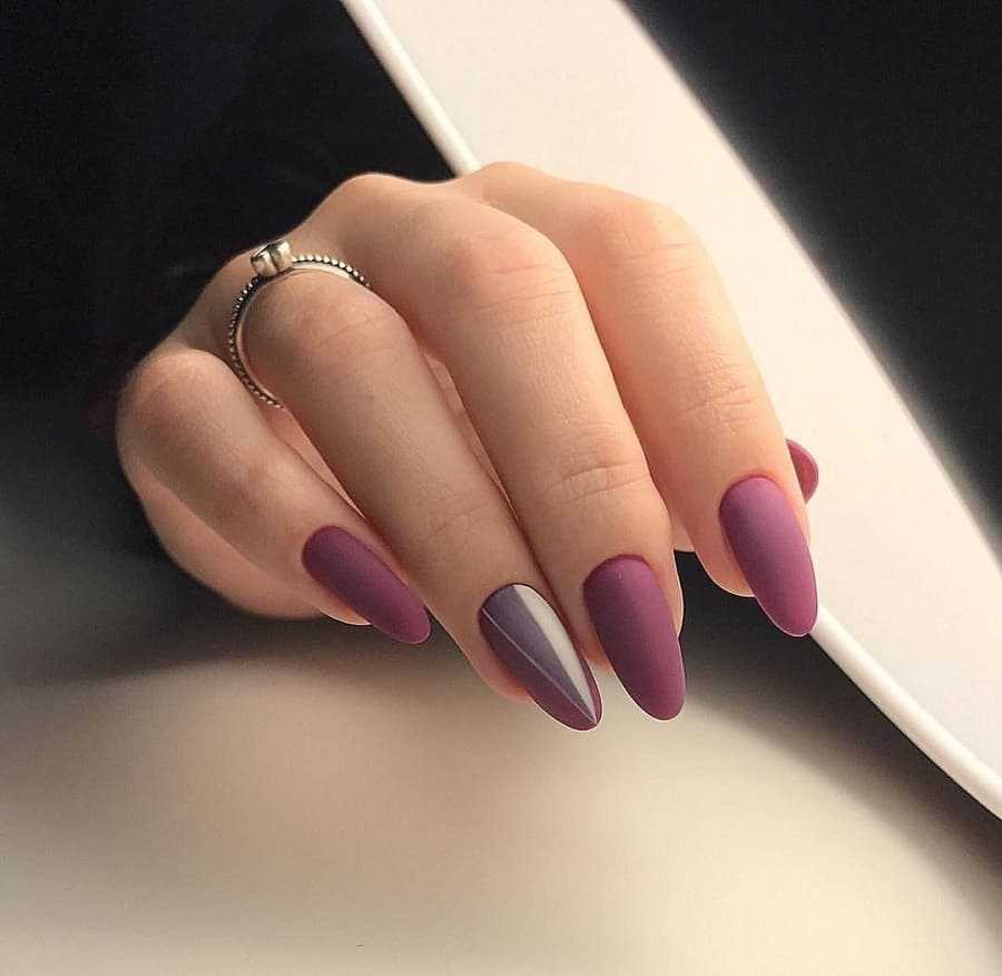 Стиль, благородство и роскошь – все это про матовый маникюр. Бархатная текстура прекрасно гармонирует с острой формой ногтей, создавая по-настоящему впечатляющий дизайн. Матовое покрытие заглушит даже яркий оттенок и облагородит маникюр.