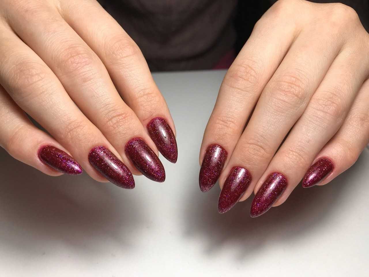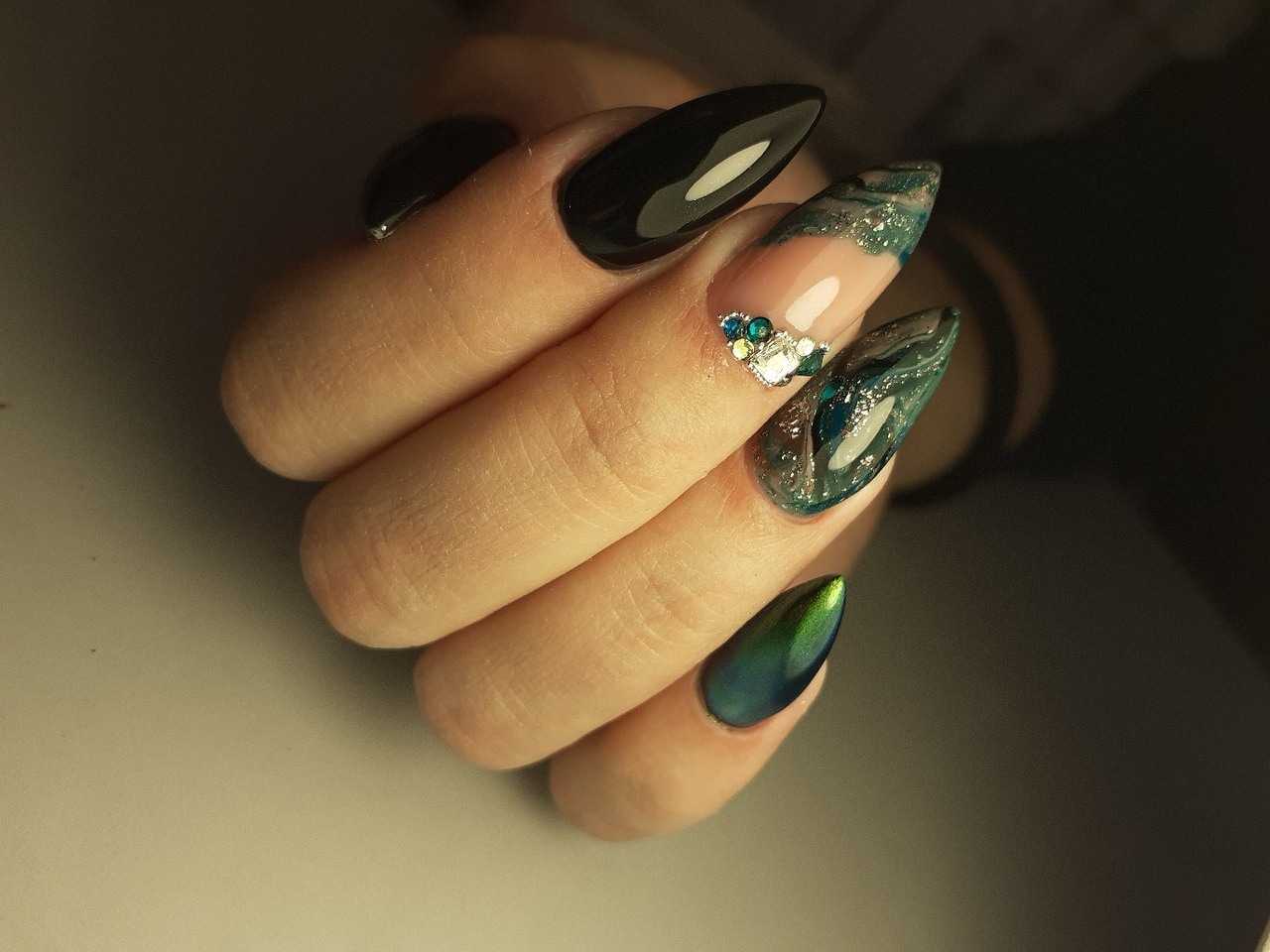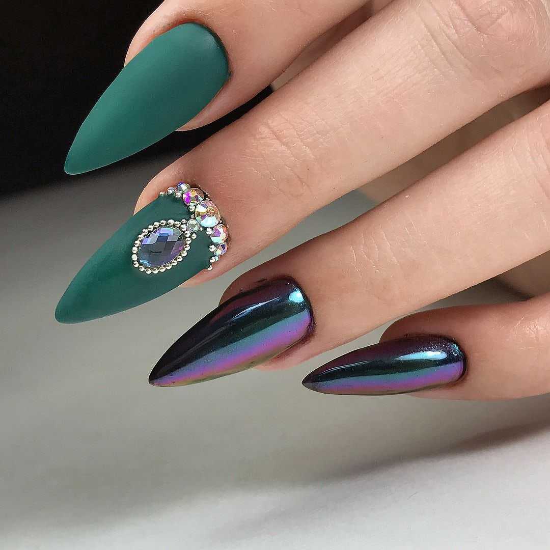 Отличной командой будут острые ногти и дизайн в стиле «кошачий глаз». Загадочные переливы цвета выглядят роскошно и напоминают текстуру драгоценных камней. Обычно такой дизайн выглядит самодостаточно сам по себе, но для особого случая может быть дополнен дополнительным декором.
