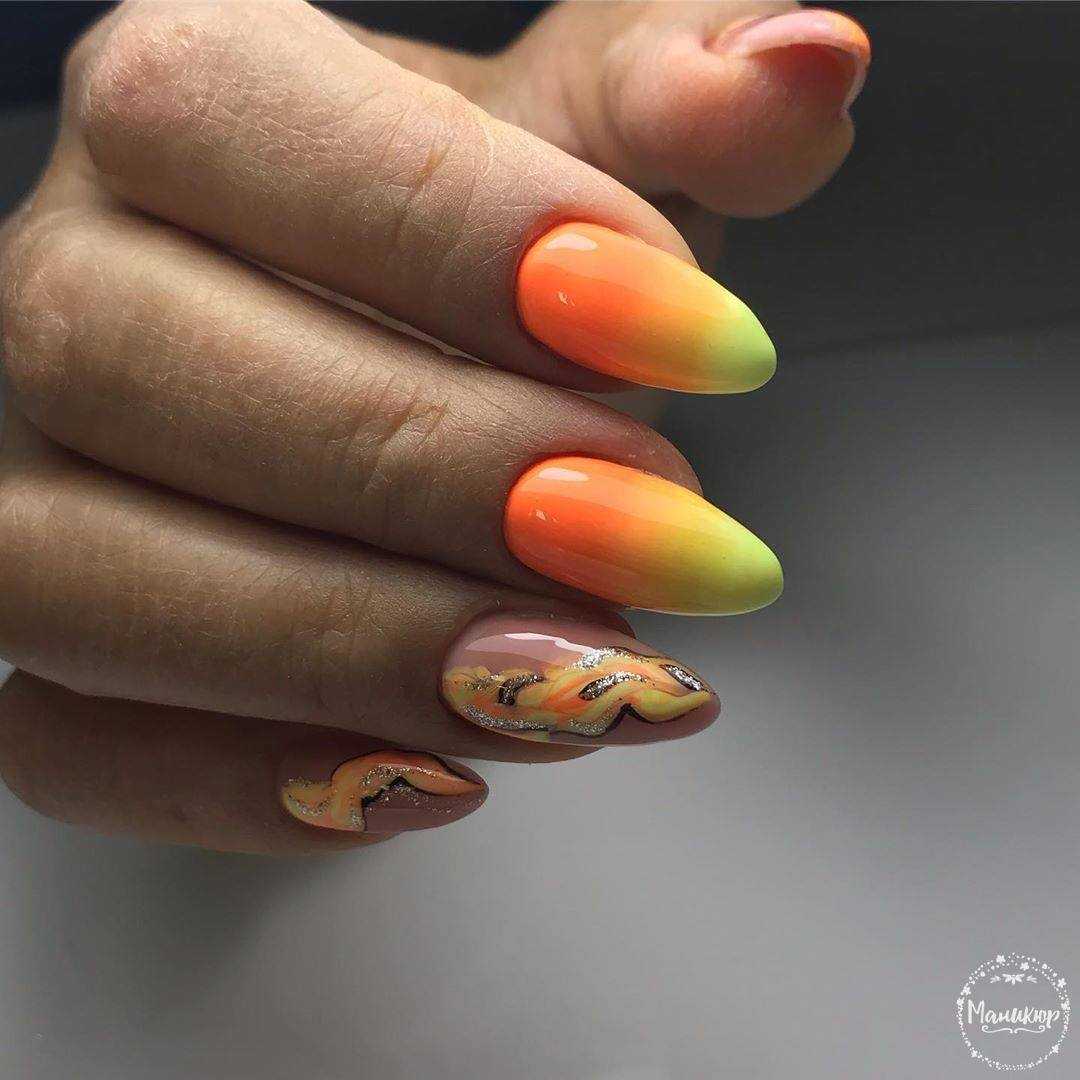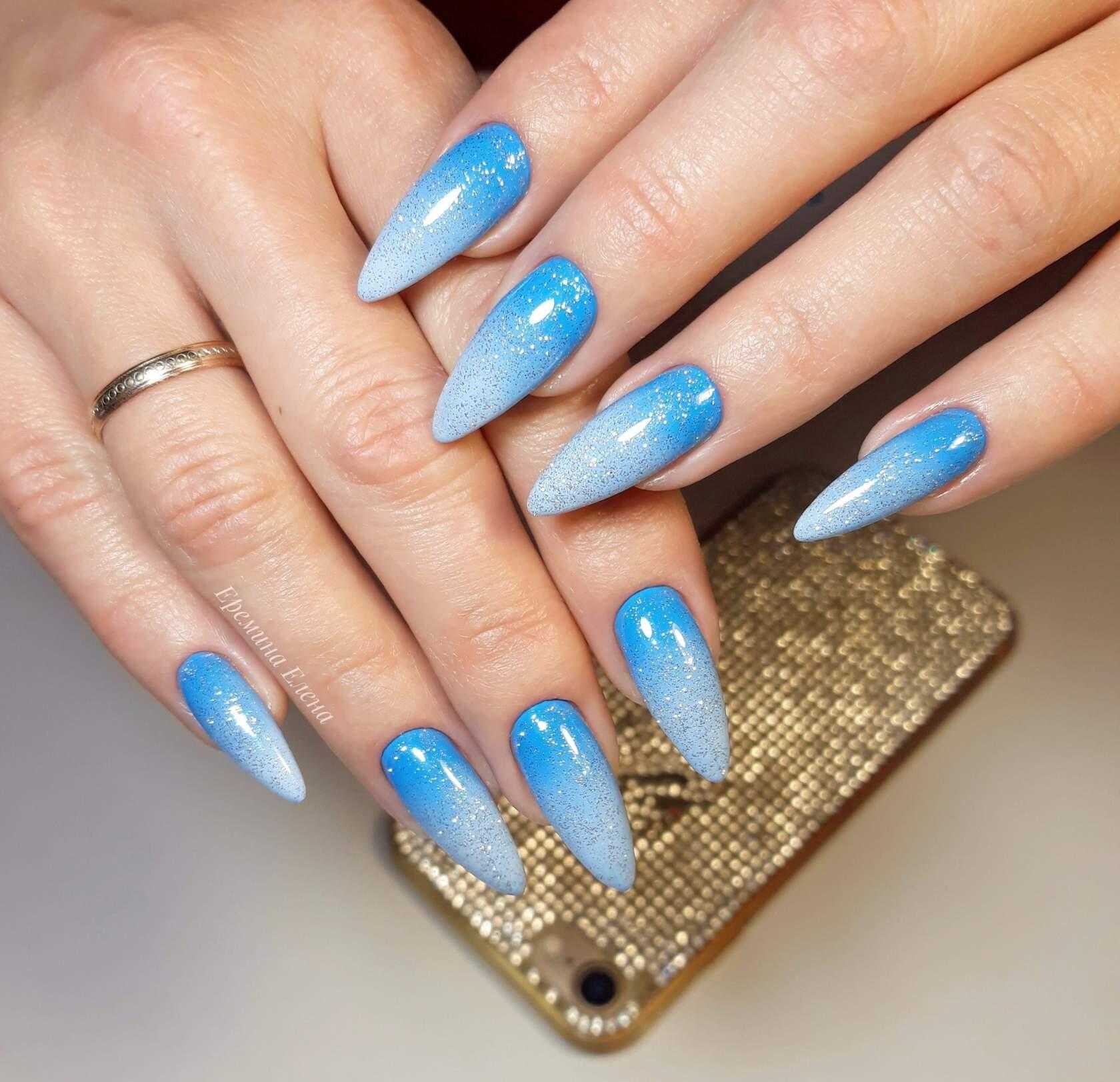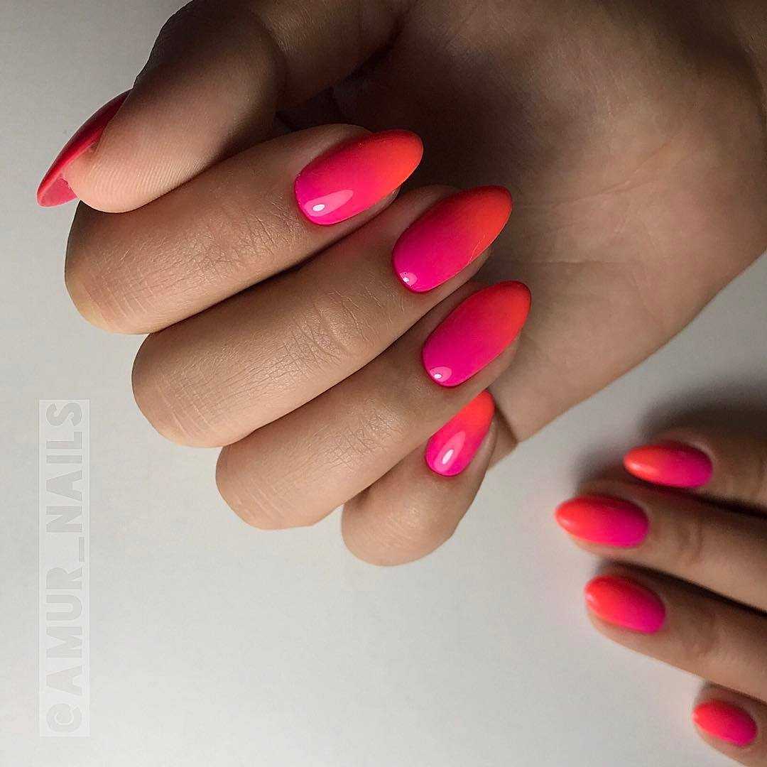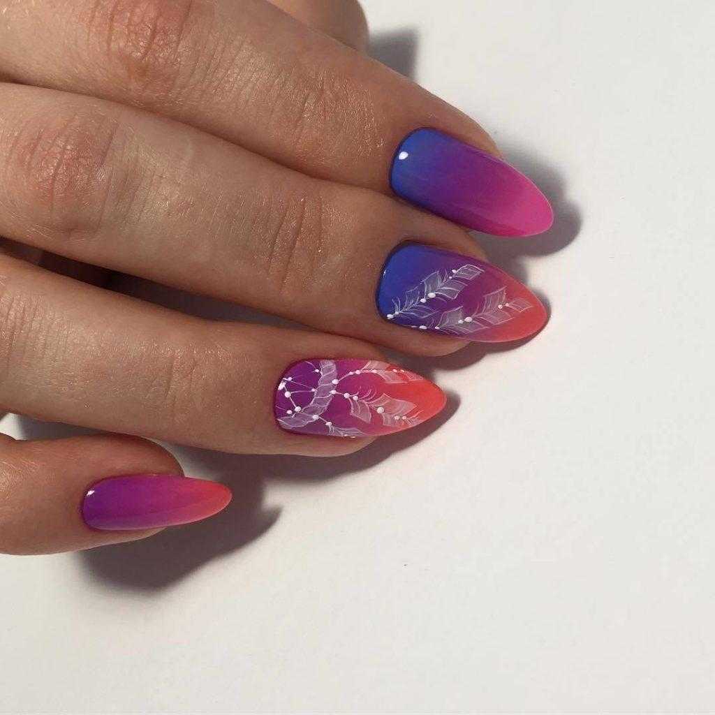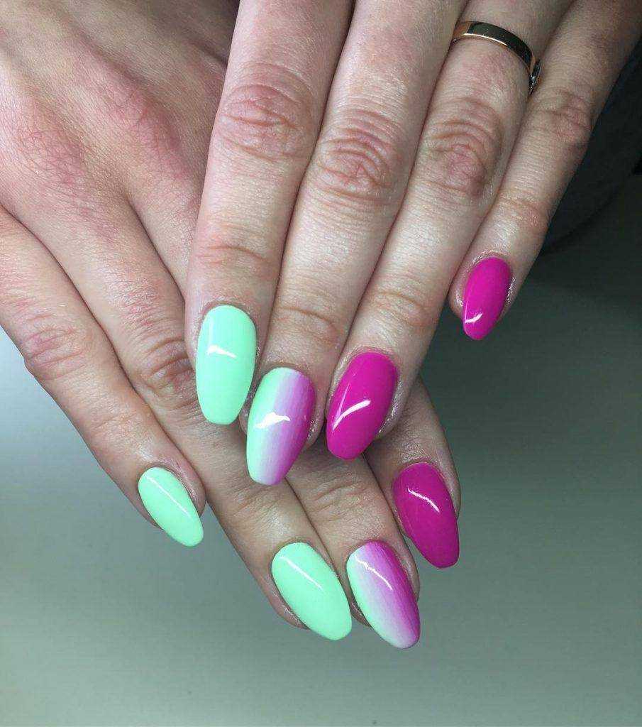 Большое пространство острой ногтевой пластины позволяет создавать удивительной красоты градиент, который переливается не только в пределах одного ноготка, но и по всем пальцам сразу. Для летних дизайнов используется 3 и более оттенка, для повседневных нейл-артов можно ограничится 2 цветами.