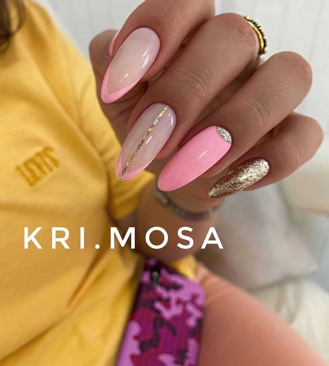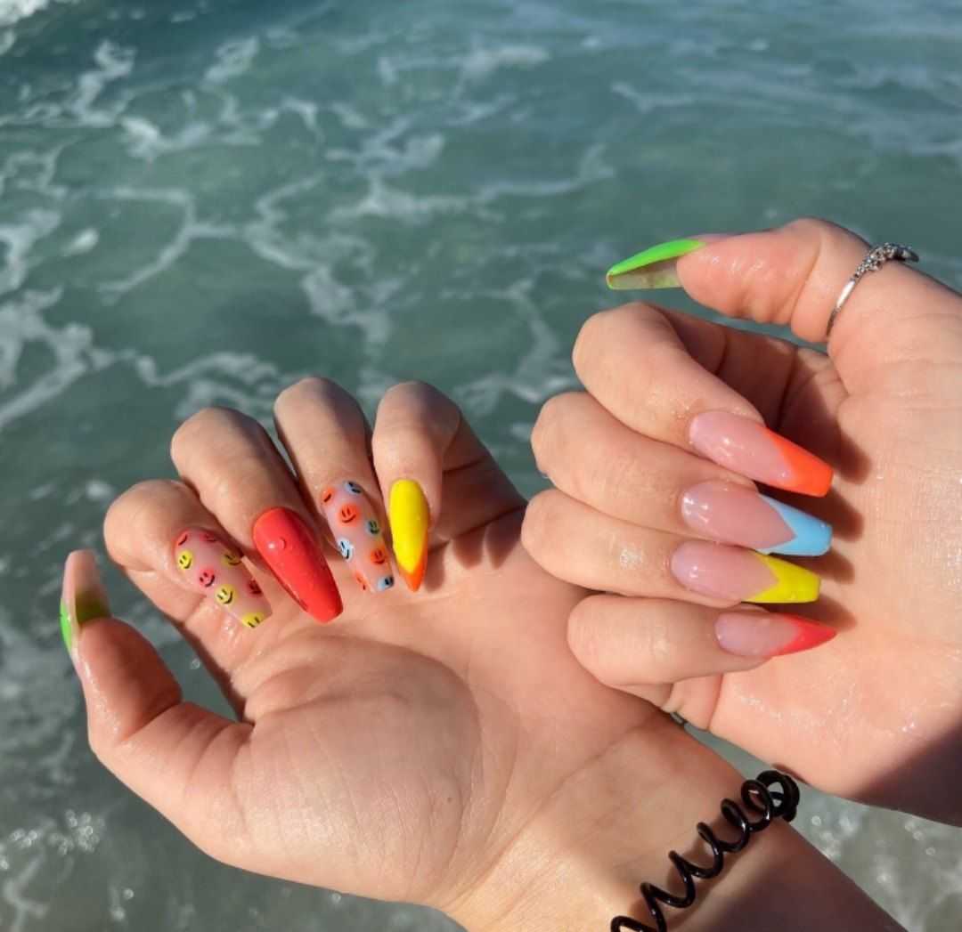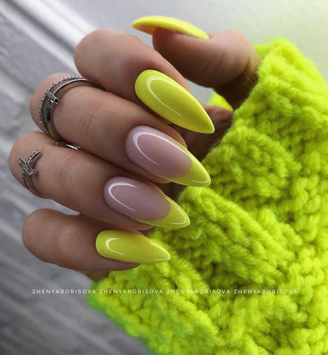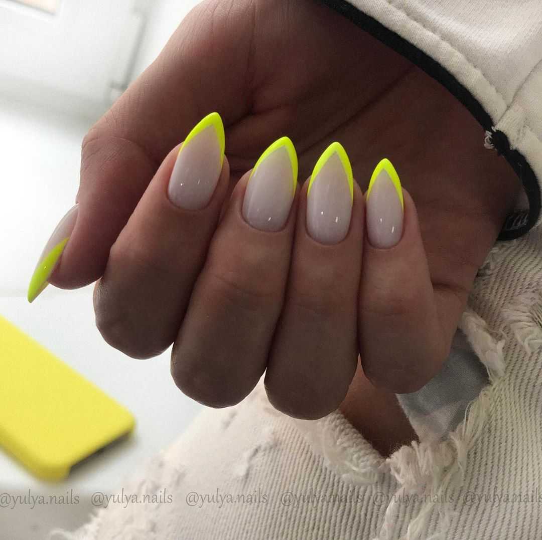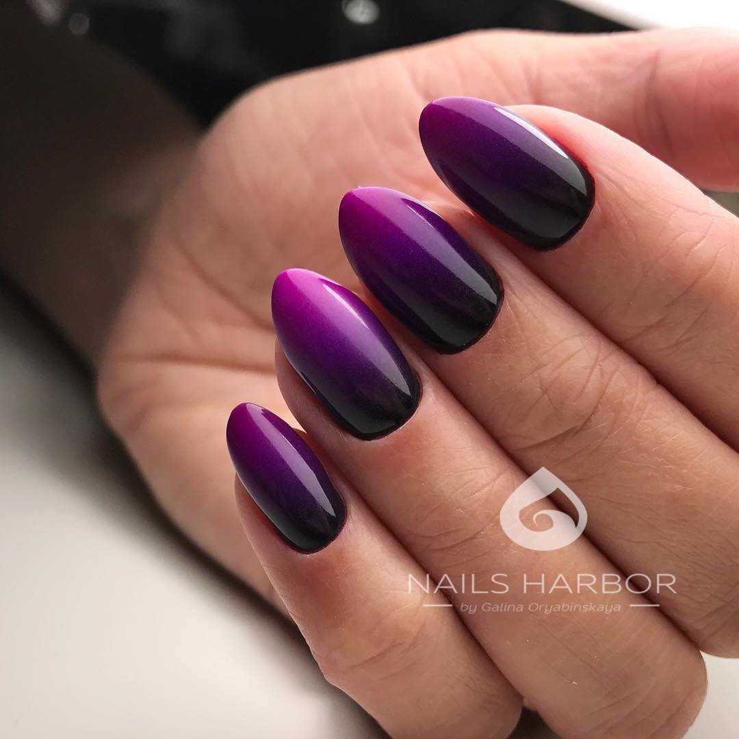 Большое пространство острой ногтевой пластины позволяет создавать удивительной красоты градиент, который переливается не только в пределах одного ноготка, но и по всем пальцам сразу. Для летних дизайнов используется 3 и более оттенка, для повседневных нейл-артов можно ограничится 2 цветами.