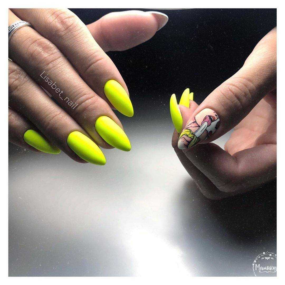Маникюр гель-лаком на острых ногтях – это настоящий холст, на котором можно рисовать все что угодно и даже создавать объемные рисунки. Не менее эффектно будет выглядеть матовый маникюр, причем цвета могут быть светлыми или наоборот яркими и броскими.