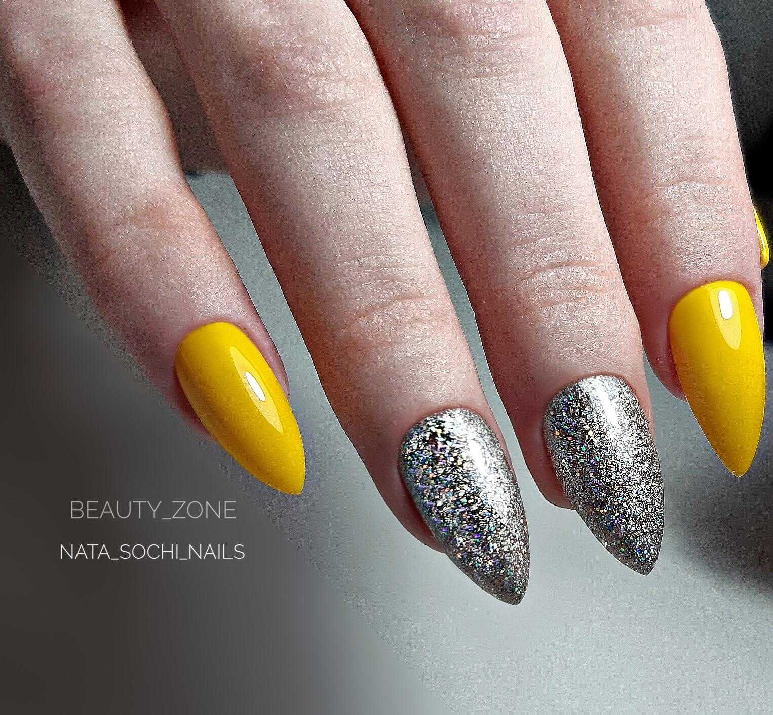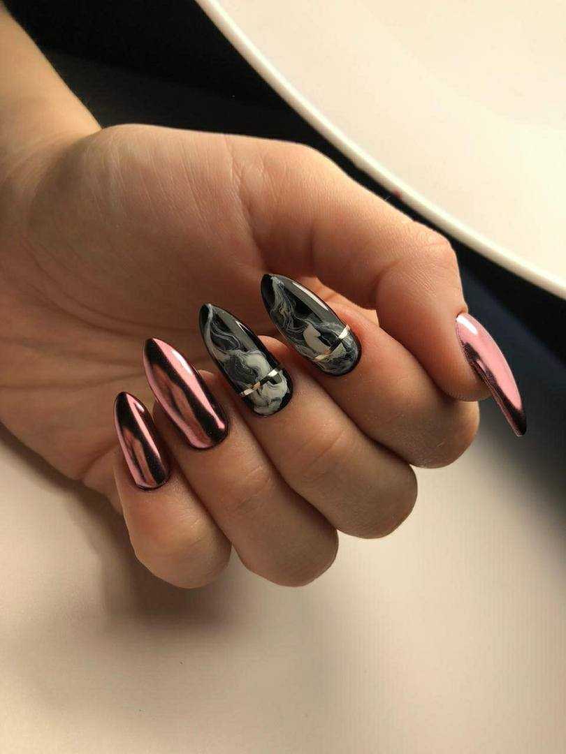 Если вы грезите об острых ноготках, но природная длина ногтей пока не позволяет воплотить эту задумку, выбирайте металлизированные лаки. Они визуально удлиняют ногтевую пластину, делают ее уже и острее. К тому же, это один из главных трендов 2018 года. Дополнением к металлическому эффекту могут быть втирка с шикарным блеском или кусочки фольги.