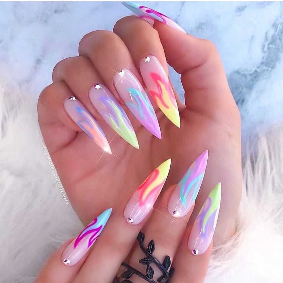 Цветовая гамма на длинных острых ногтях допускается абсолютно любая. Яркие оттенки подчеркнут индивидуальность своей обладательницы, более спокойные подойдут для рабочей и повседневной обстановки. Для вечеринок и других праздничных мероприятий можно воспользоваться различными декоративными элементами, которые смогут дополнить и украсить необычный длинный маникюр.