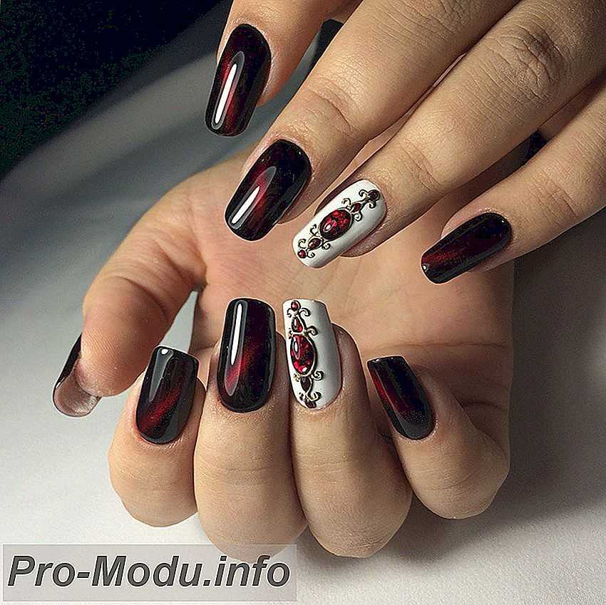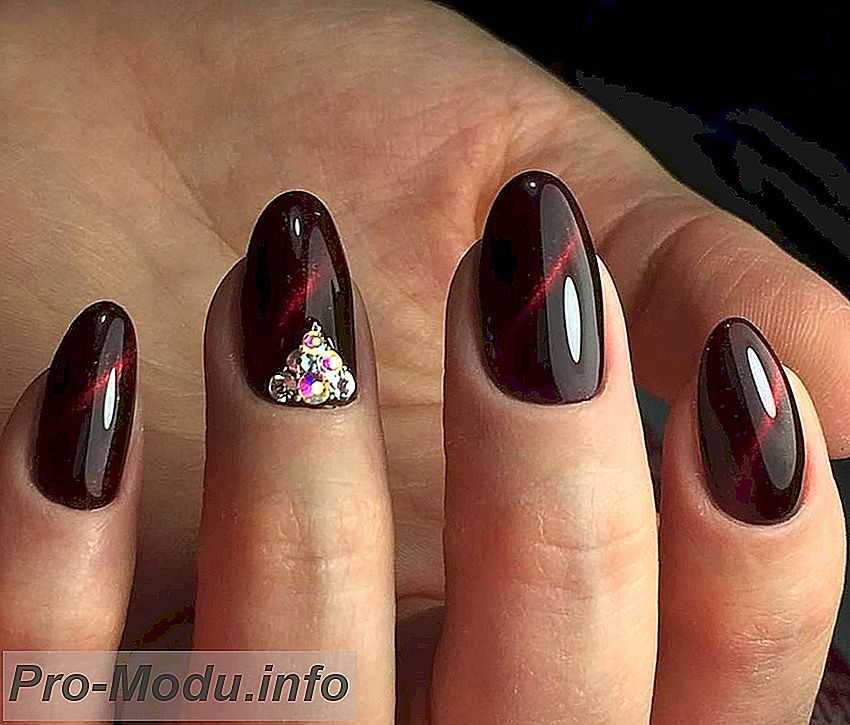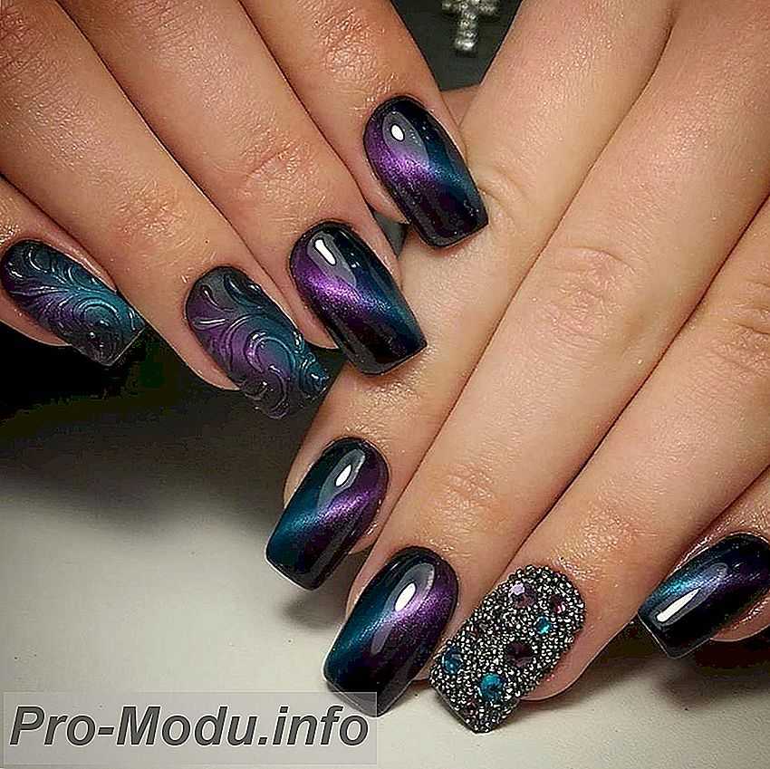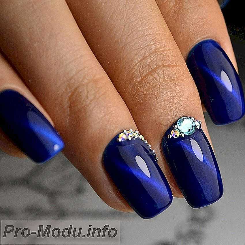 Маникюр «кошачий глаз» отлично смешивается со стразами. Выделите ими прикорневую лунку либо край ногтя. Таковой дизайн смотрится очень красиво, к тому же магнитное покрытие только что начинает покорять ноготки модниц и у вас есть шанс стать первой ласточкой этого престижного и перспективного тренда.