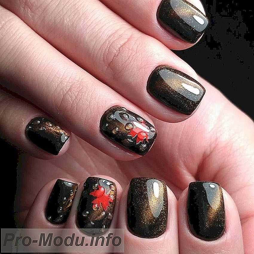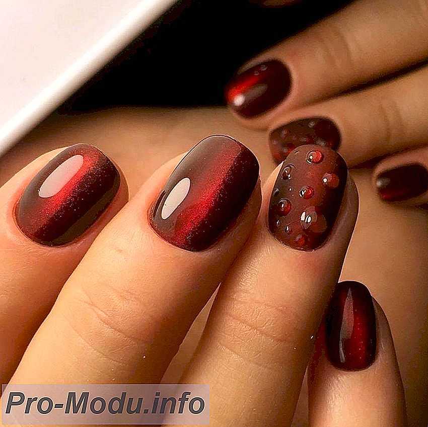Одна из самых интересных новинок сезона – маникюр с капельками. Кажется, что на темном покрытии одного-двух ноготков застыли прозрачные капельки воды – выглядят это очень необычно, нежно и оригинально. Этот дизайн великолепно смотрится на однотонном матовом покрытии и отлично сочетается с маникюром «кошачий глаз».