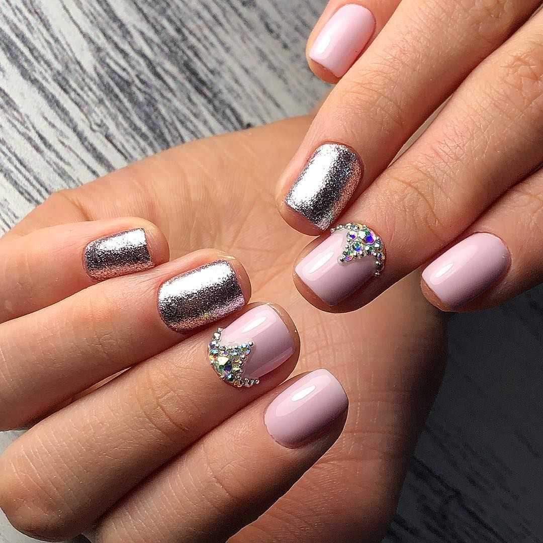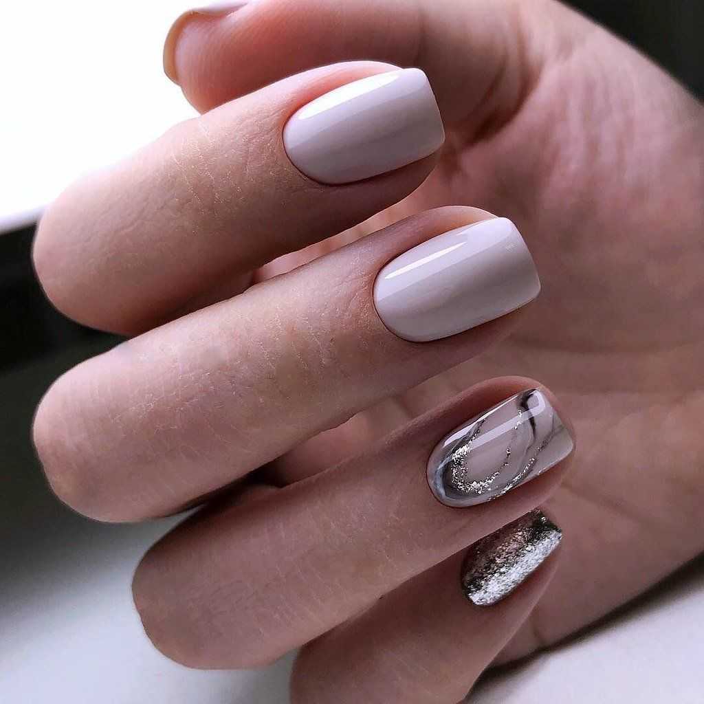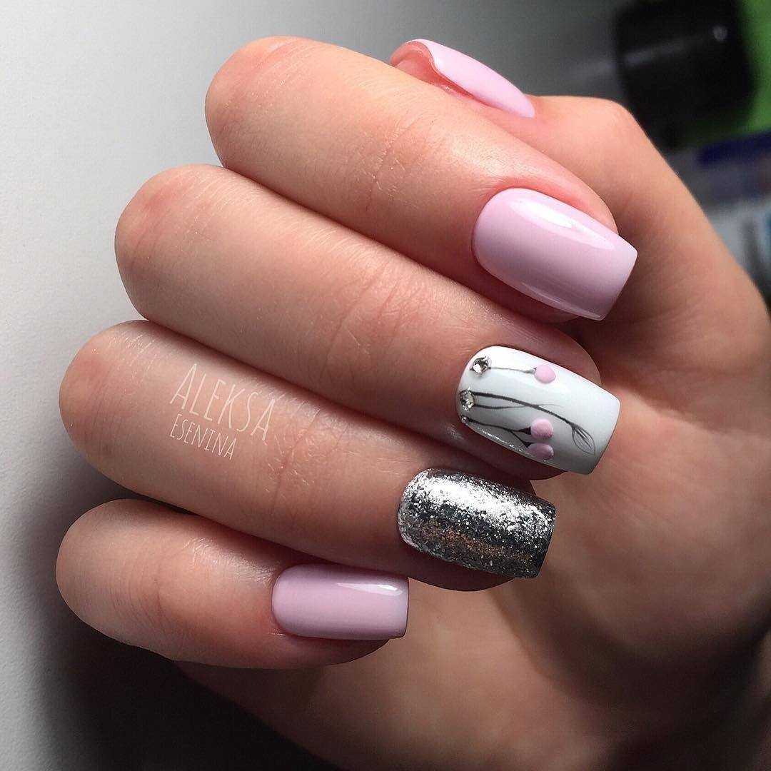 Оптимальная возможность добавить оригинальности в маникюр — выполнить на одной руке однотонное нежное розовое покрытие, а на другой дизайн. Красивый дополнительный бежевый оттенок, а также легкие узоры и аккуратный декор с серебром/позолотой, которые встречаются часто в идеях маникюра для офиса, делают дизайн элегантным и утонченным.