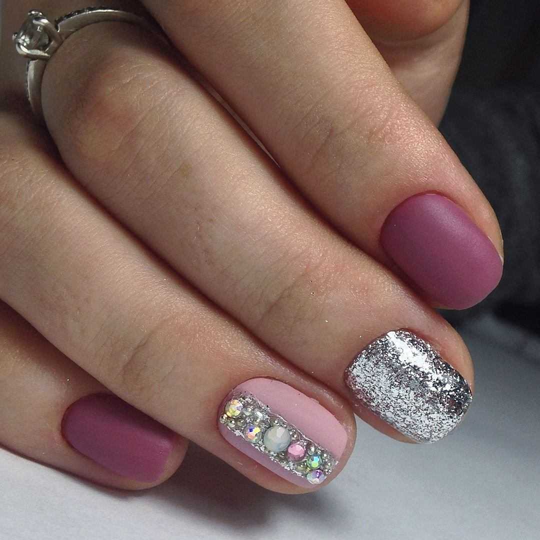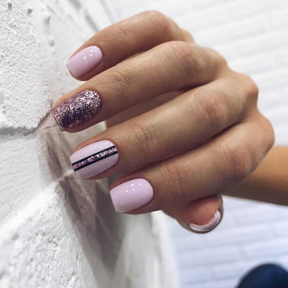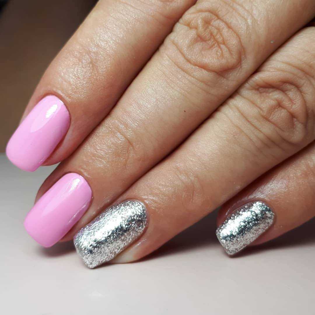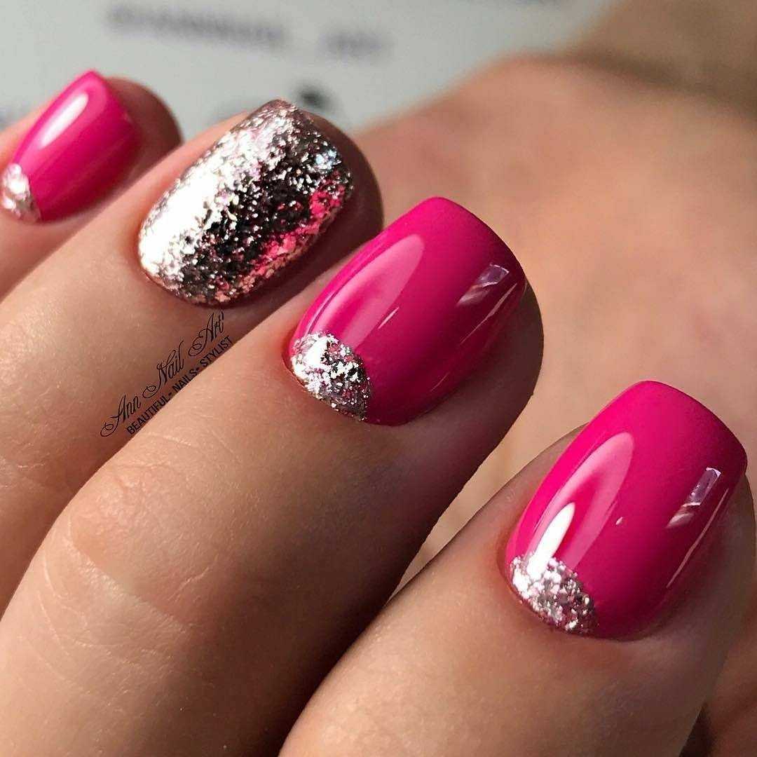 Маникюр с однотонным дизайном розовыми блестками/фольгой всех пальчиков подходит загорелой и бледной коже. А если хотите экспериментов, попробуйте блестками украсить только кончики ногтей, выполнить растяжку или дизайн.