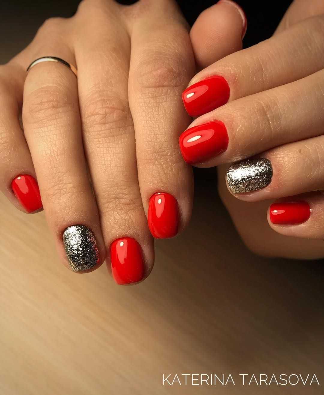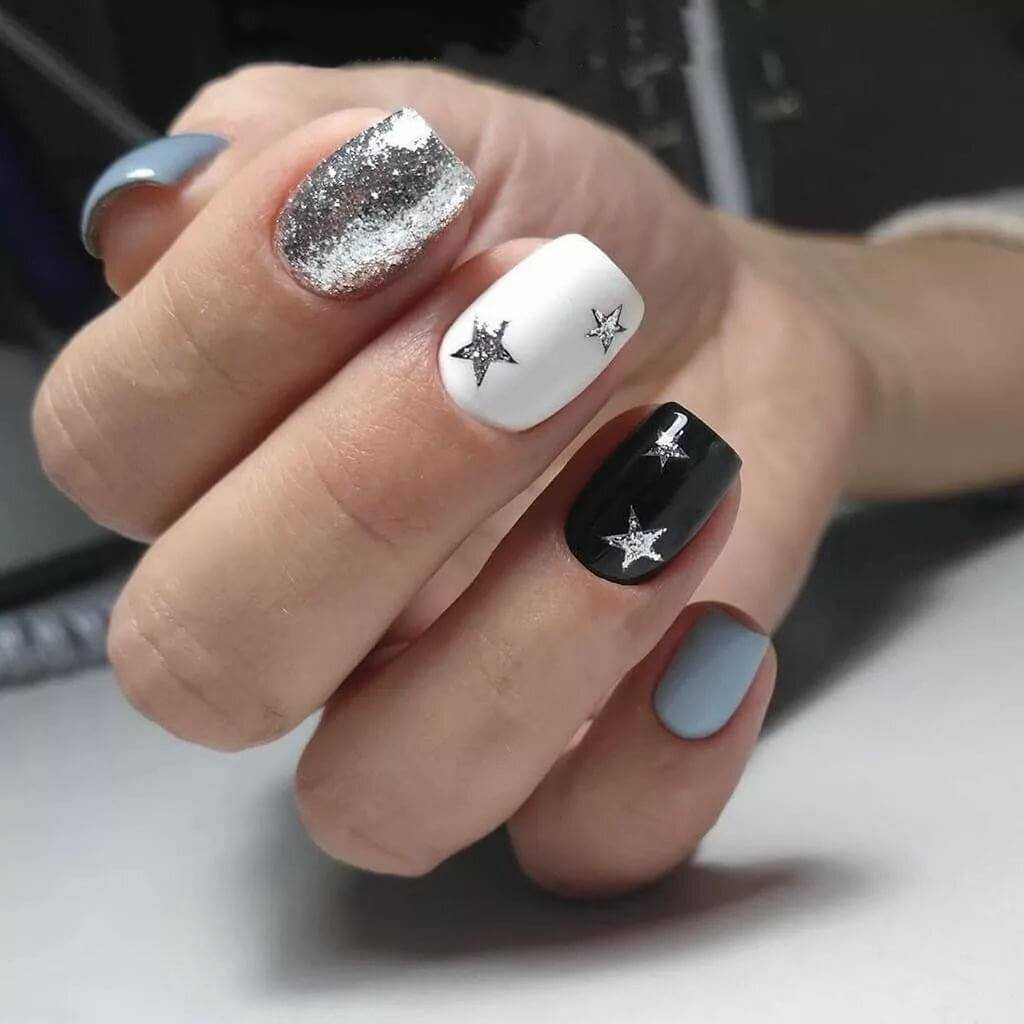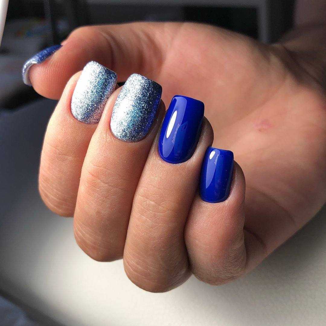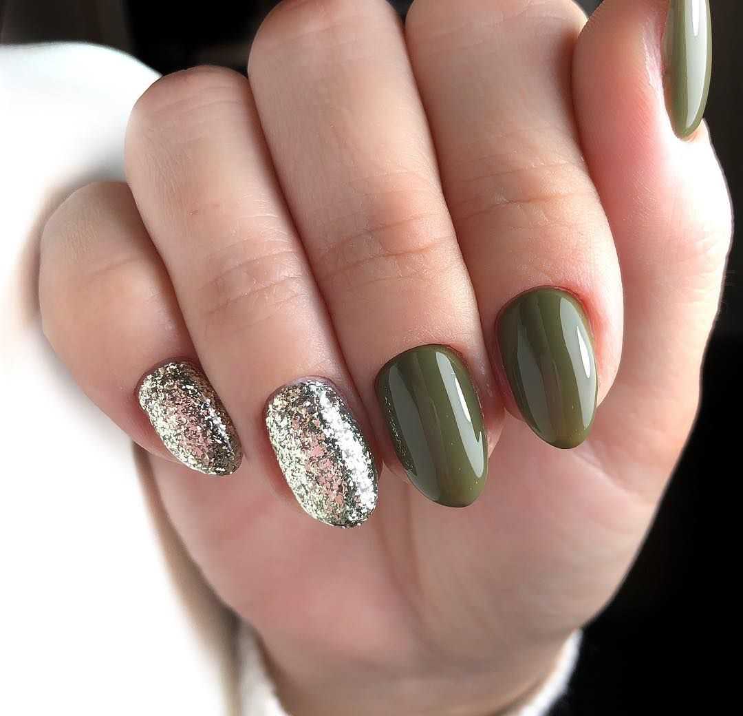 Выигрышно смотрятся блестки серебра или золота на таком фоне. Но, если хотите добиться яркого эффекта — берите разноцветный глиттер. Украсьте ноготь полностью, сделайте глиттерный градиент или создайте блестками узор. Все перечисленные идеи — главный хит этого года!
