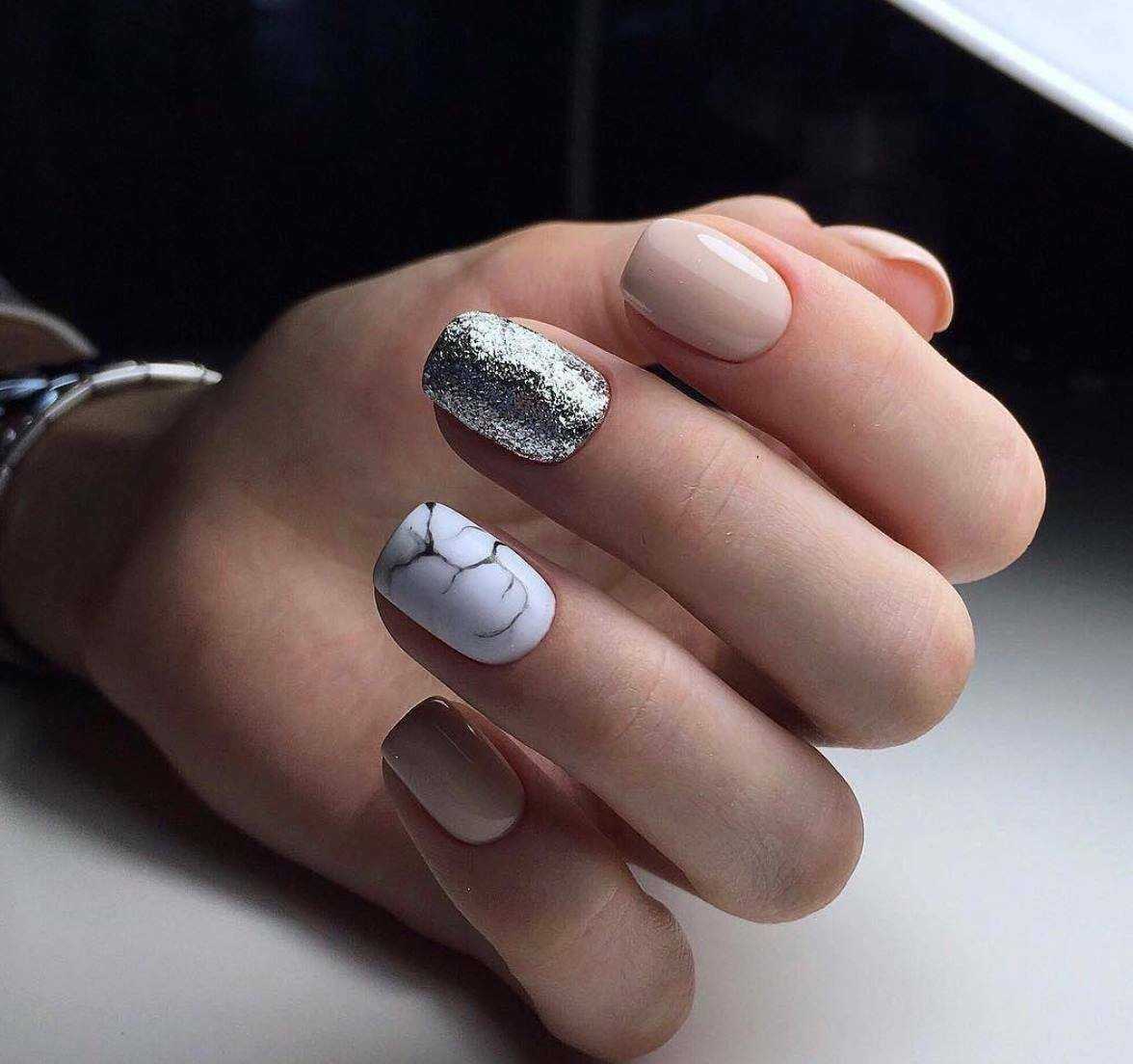 Оформляем ноготки выбранной базой и наносим сверху при помощи скомканной фольги разводы. Чтобы максимально приблизить рисунок к натуральному, мастера рекомендуют использовать лак светлее или темнее основы или сочетать одновременно несколько оттенков. Блёстки в этой вариации могут наноситься на уже готовый дизайн либо принимать непосредственное участие в оформлении, красиво выделяя акцентный ноготок.