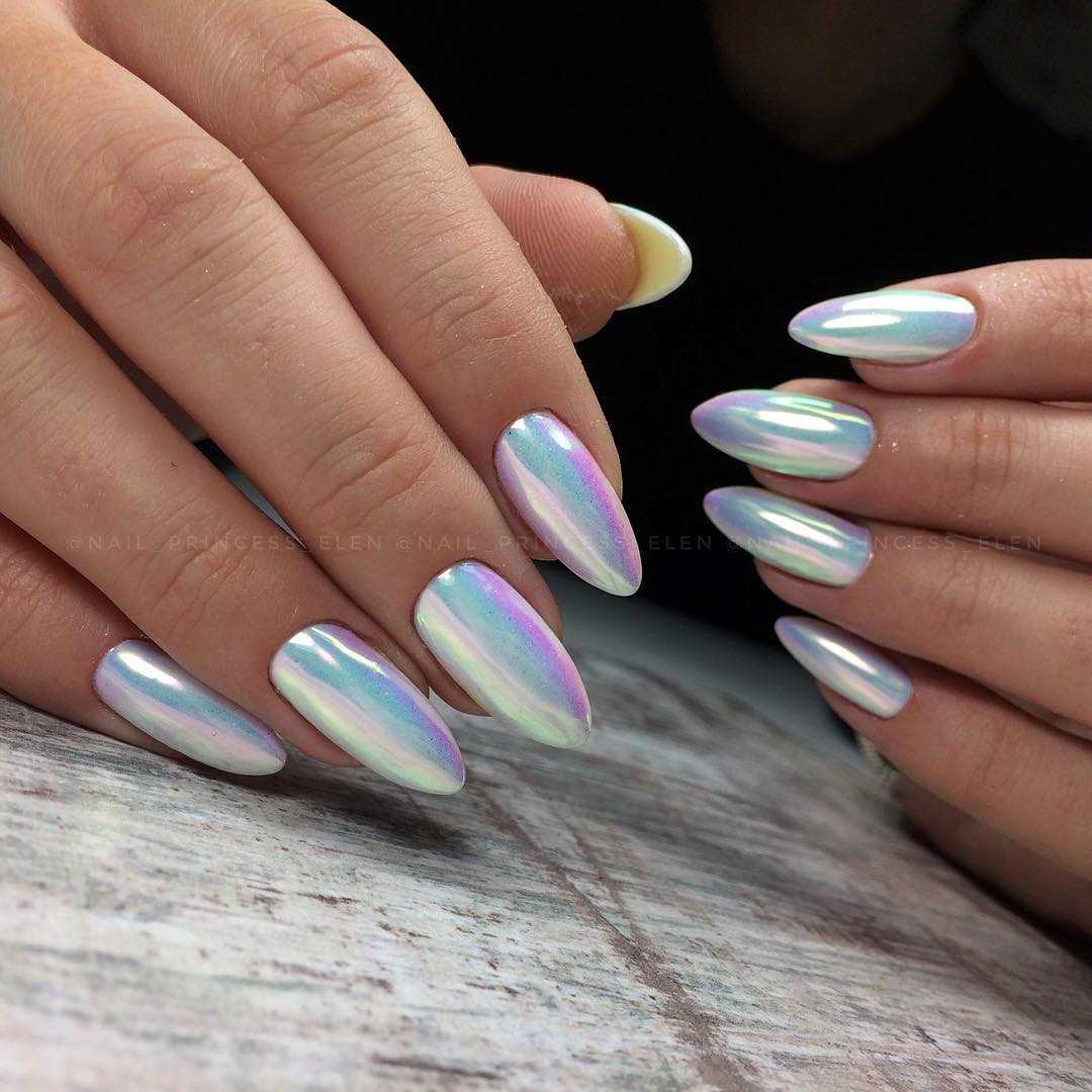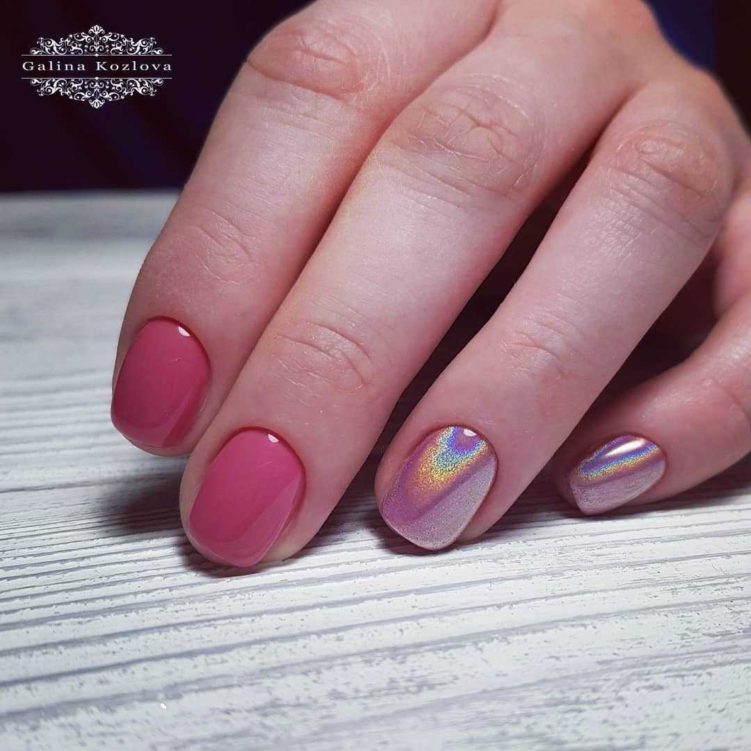 Втирка не претендует на самый модный и новый декор, но погружает в приятную атмосферу, наполненную гламуром, легкостью и шармом. Однотонные розовые переливы или радужные — это классика праздничного дизайна ногтей.