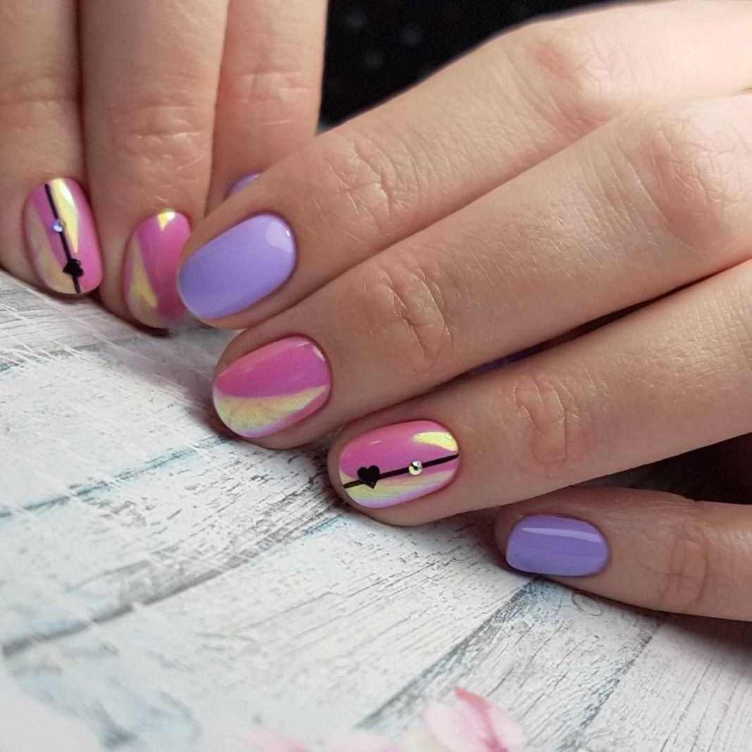Что касается цветовой гаммы, то розовый с черным хорошо сочетаются. Новинки 2019 года представлены на фото, маникюр получается нежным и утонченным. Яркий узор сможет выделиться на нейтральном фоне. Элементы декора в таком дизайне применяются редко. Но это не говорит о том, что украшения будут не уместны.