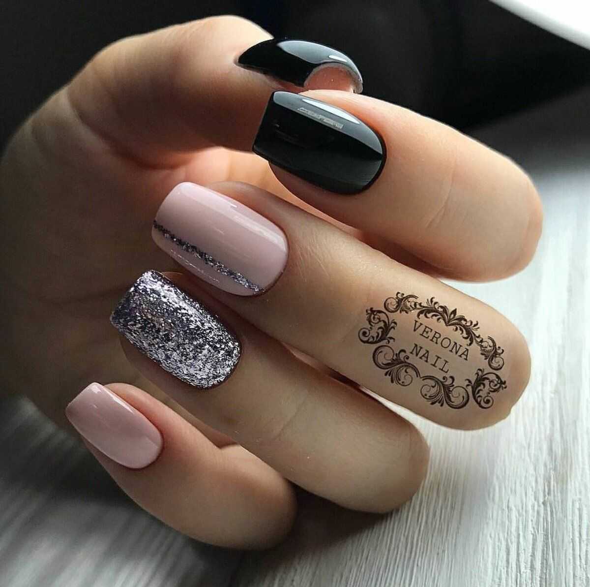 Чтобы маникюр приобрел изюминку, в работу следует добавить черный лак с розовым. На фото представлены интересные идеи.