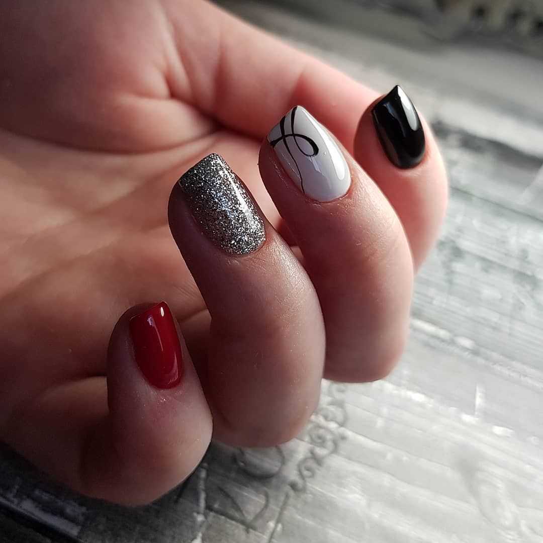 В черном цвете отлично смотрится геометрический декор. Глиттер используется для прорисовки отдельных зон на узоре, для сплошного покрытия ногтей. Присмотритесь к французскому маникюру с серебряным или золотым глиттером по краю ногтевой пластины. Визуально блестящая “улыбка” френча будет удлинять ноготки, делать маникюр эффектнее и благороднее.