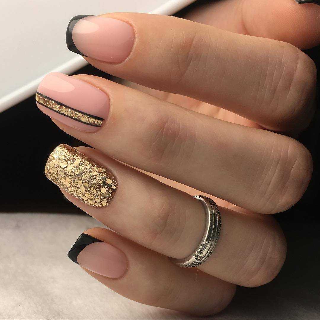 Если хочется немного поэкспериментировать, стоит выбрать маникюр черный с розовым и золотом. Френч в таком исполнении не останется незамеченным. Линия улыбки, оформленная блестками, это то что нужно для вечеринки. Каждая модница сможет почувствовать себя настоящей королевой.