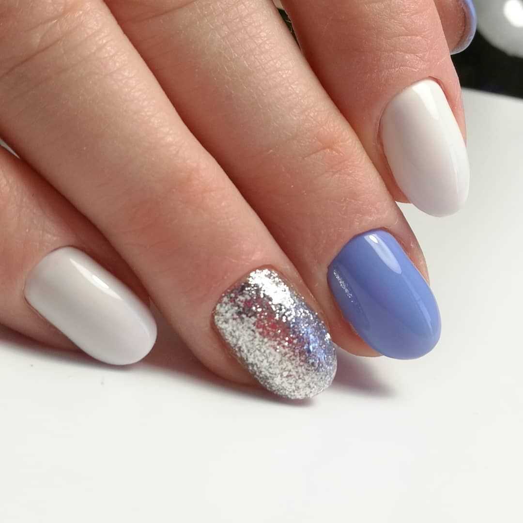 Для однотонный нейл-артов выбирайте мягкие оттенки розового, голубого цветов. Особенно красиво смотрится белый маникюр с серебряными или золотыми блестками. Это тренд последних сезонов, который очень нравится девушкам и не собирается сдавать своих позиций. Под блестящий декор отводите несколько пальцев на руке. Для этого покройте их гель-лаком с блестками в несколько слоев, воспользуйтесь втиркой, пайетками, сухими блестками.