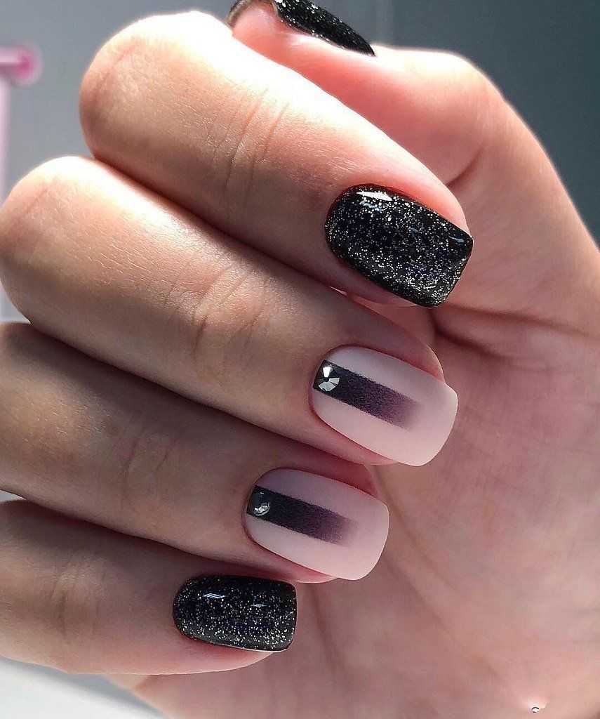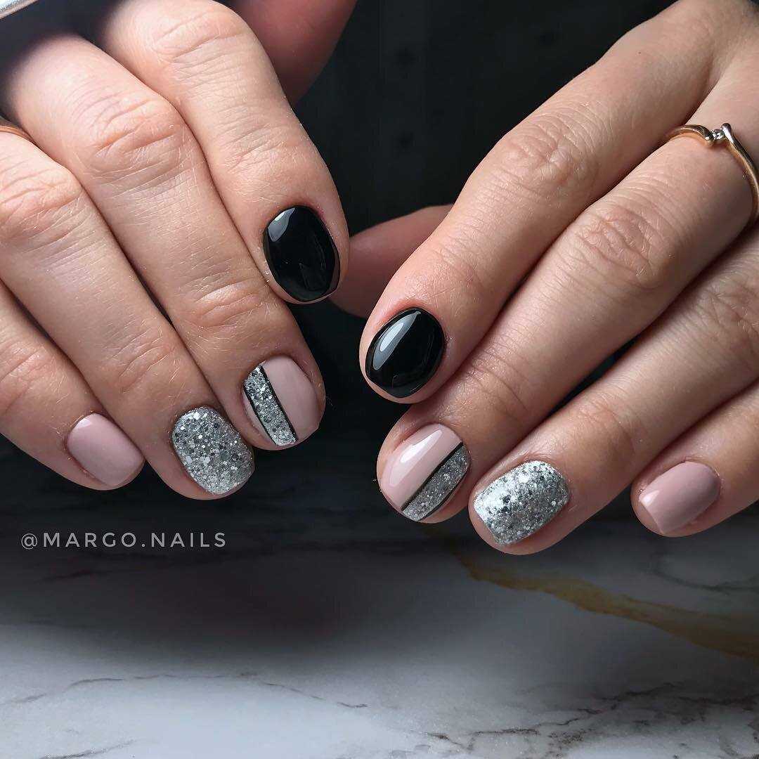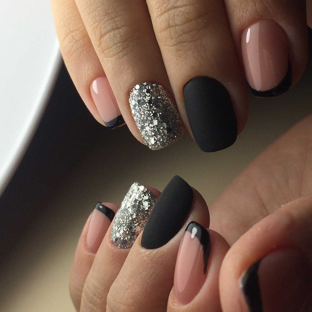Сочетание черного с розовым и серебристым лаком бесподобно. Выполнить работу можно в домашних условиях, для этого необходимо подготовить глиттер. Его можно наносить как на край ногтя, так и использовать в качестве основного цвета. Не менее интересно смотрится градиент. В этом случае подчеркнуть переход оттенков можно с помощью блесток.