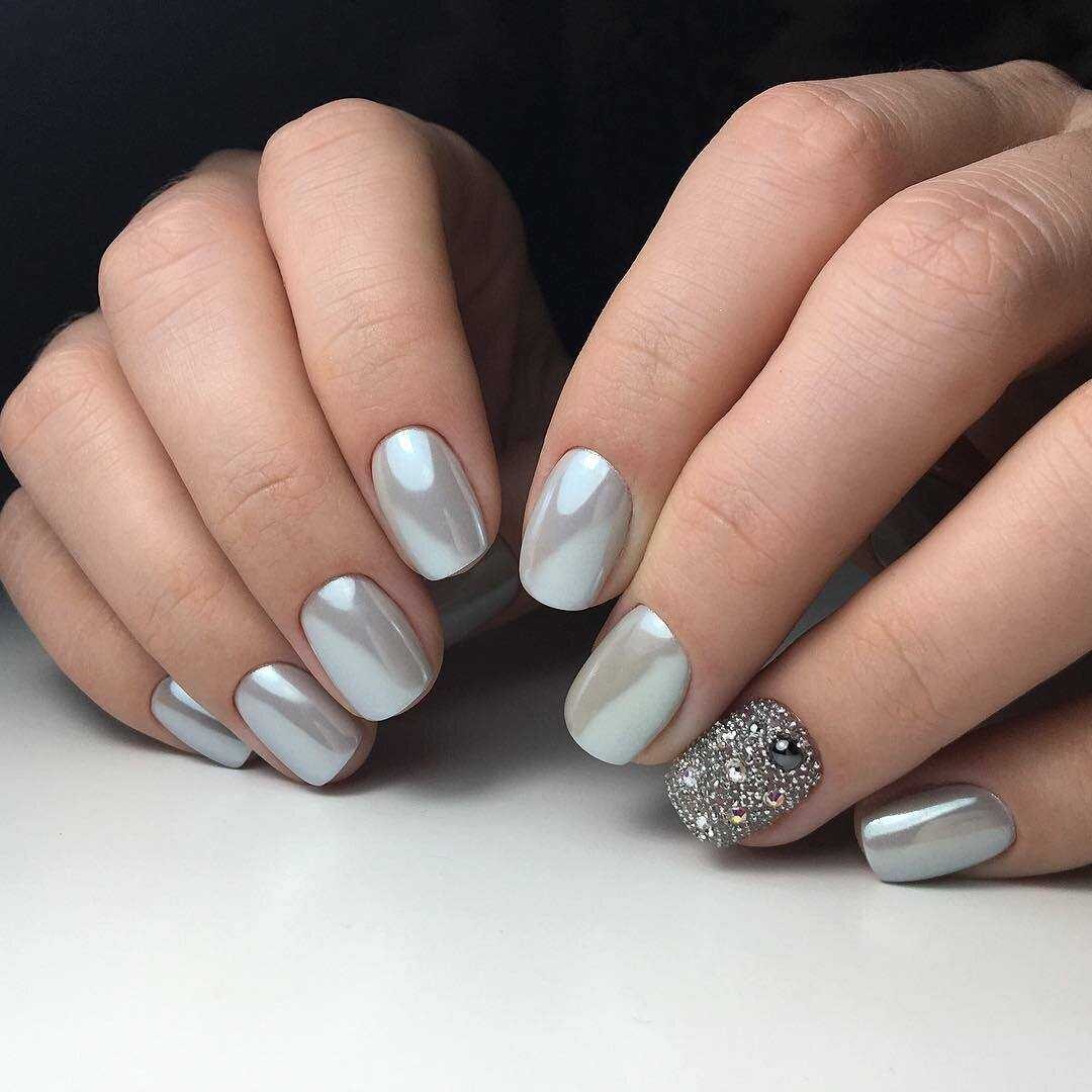 На коротких ногтях предпочтительнее использовать светлые оттенки гель-лака и втирки. Лучшее решение для нежного и женственного дизайна ногтей – это жемчужная втирка. Она великолепно смотрится на белом и розовом фоне. Такой маникюр практически не нуждается в дополнительном декоре, но девушки не упускают возможности приклеить на ноготок стразы, бульонки, украсить ногти гелем-паутинкой и другим декором.