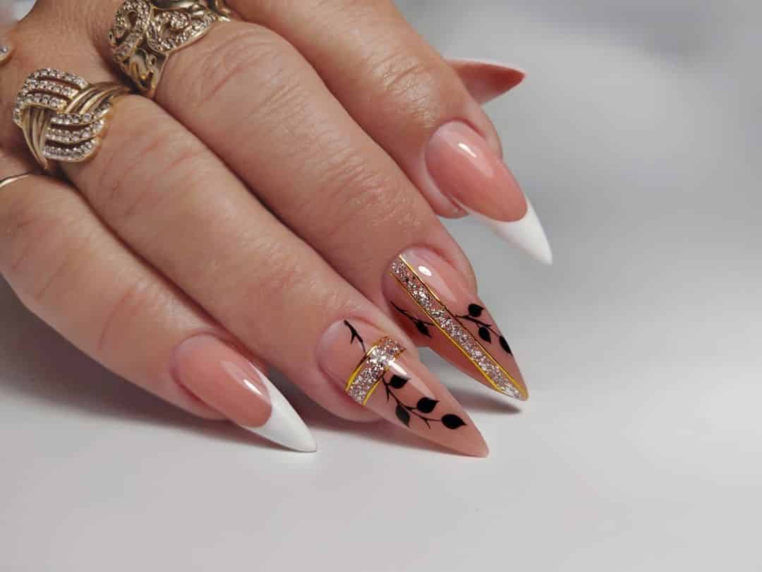 С длинными острыми коготками забудьте об обычном френче, ведь здесь выбор дизайна улыбки поистине безграничен. Например, можно сделать аквариумный дизайн с самыми разными элементами, сделать френч из неровных полосок разных или похожих оттенков, а также – украсить всё это дело блёстками или стразами.