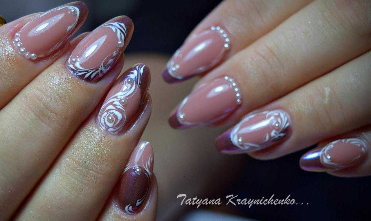 Отличным сочетанием в свадебном маникюре является соединение нескольких элементов- страз и вензелей. Но если это ногти для невесты, то и вензеля должны быть нежного, белого цвета.