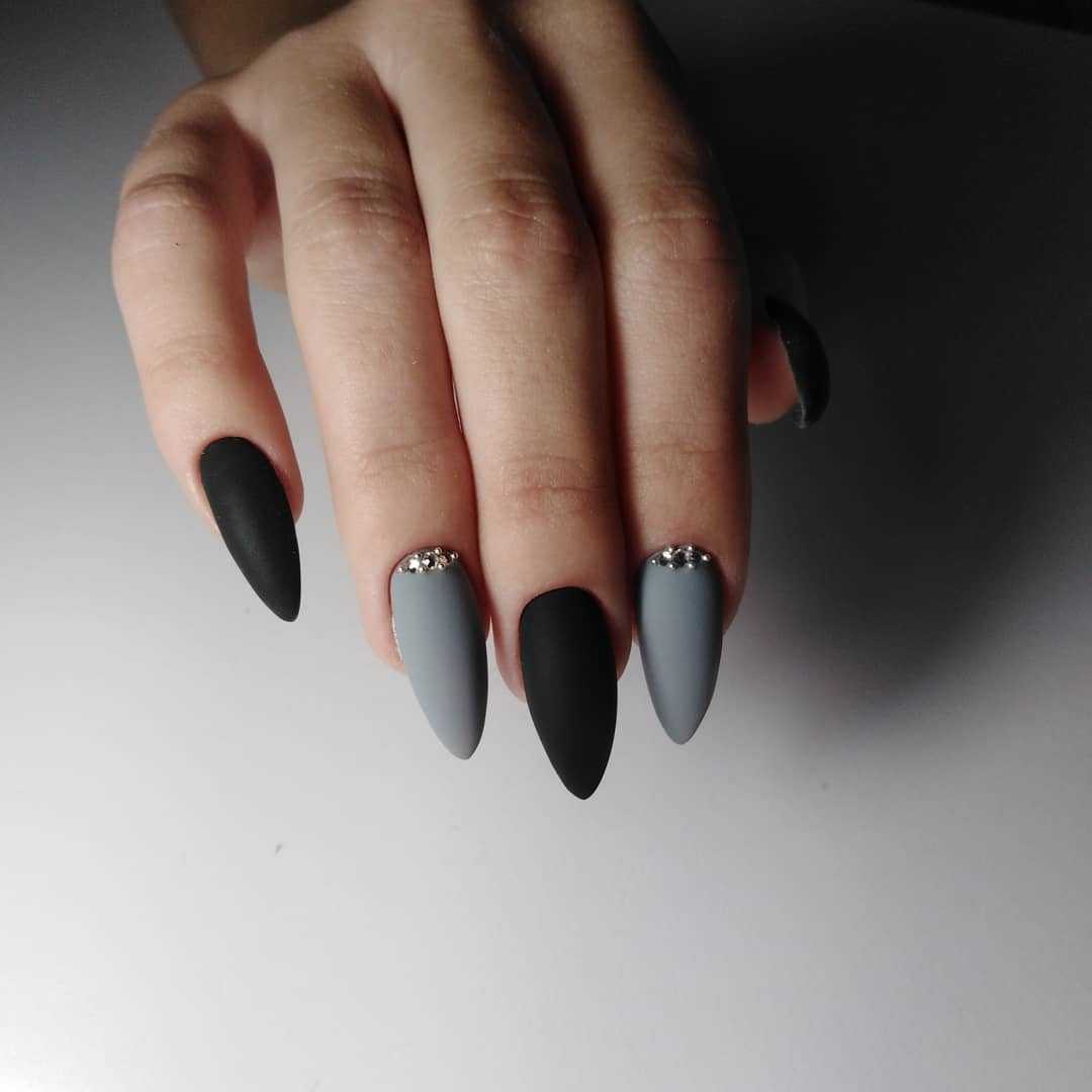 Матовые покрытия на остром маникюре смотрятся нежно, тепло и загадочно. Его можно оставить совсем без украшений, выбрав однотонный вариант.