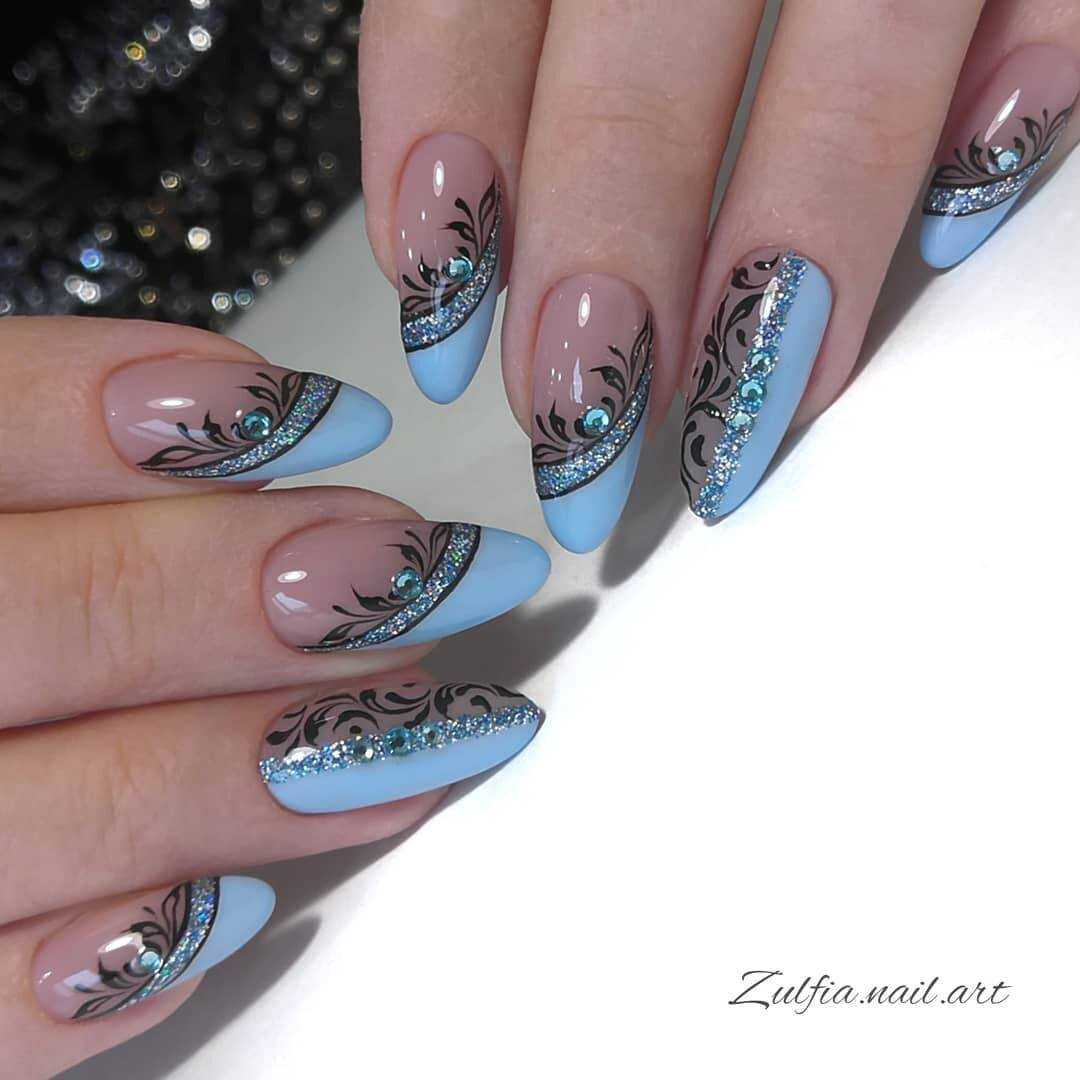 Сделать классический френч, но синим цветом – почему бы и нет? Лунный дизайн тоже сделать не проблема, тем более, что цветовой гаммы для гармоничного сочетания предостаточно. В дополнение к выбранной стилистике подбирается декор (украсить ногти блесками, стразами).
