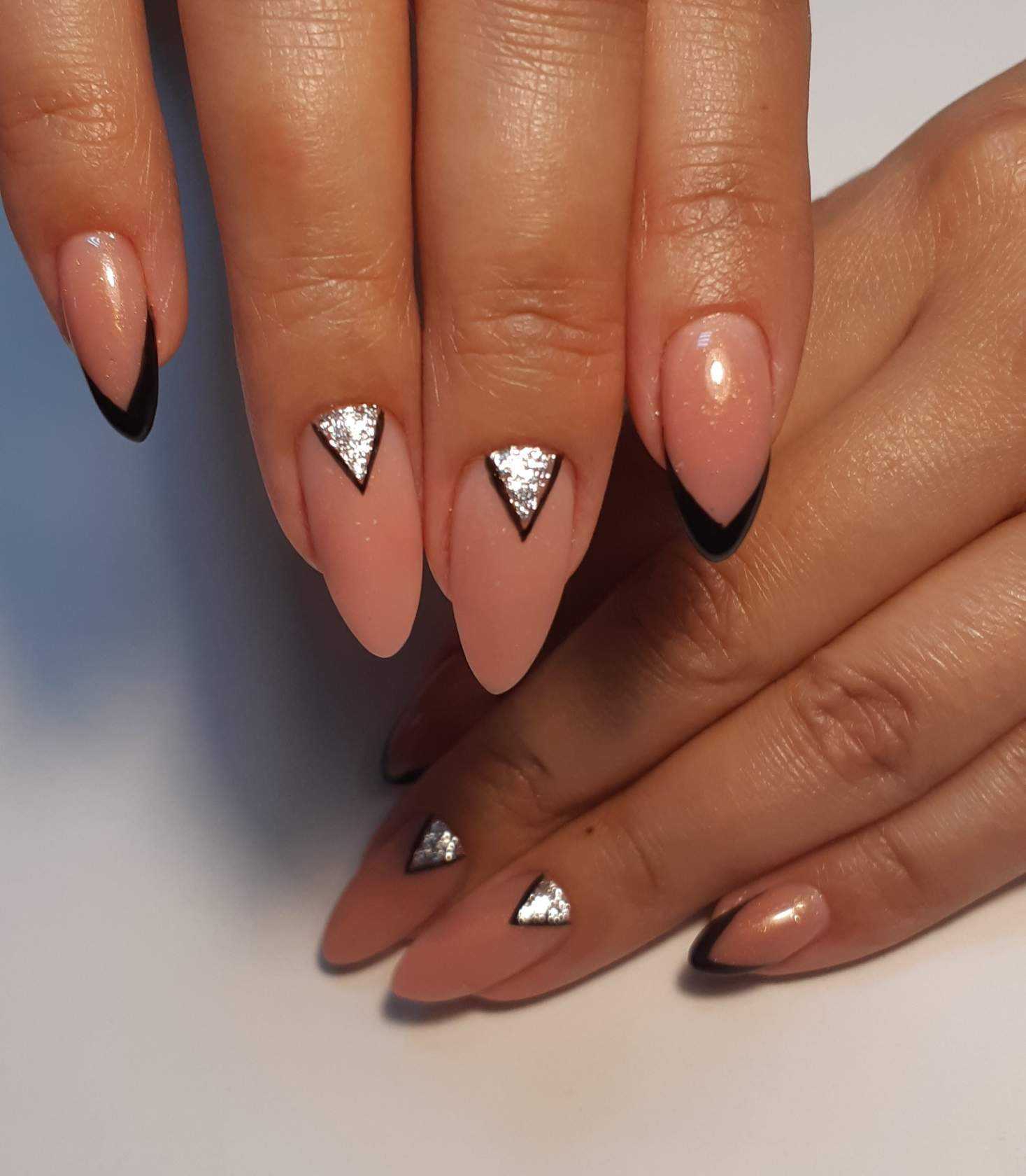 - Такой маникюр никого не оставит равнодушным. Матовый мятный, глянцевый розовый и стильный серебристый акцент великолепно гармонируют между собой, а миндальная форма ногтей отлично дополняет их.