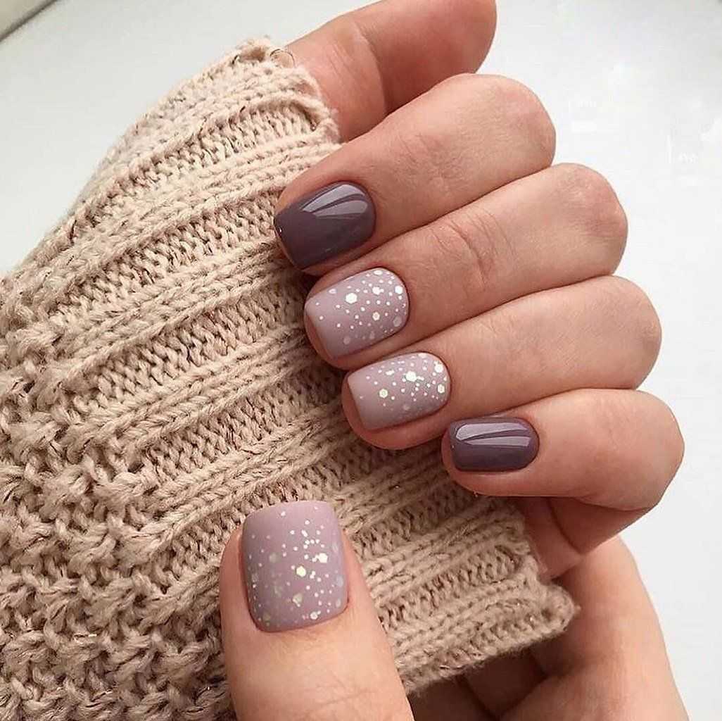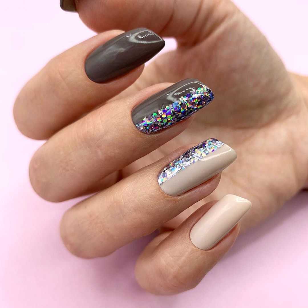 Подчеркни несколько ноготков без цвета, лишь с помощью контрастных текстур. Матовые и порошковые поверхности, а также глиттер и блестки создадут праздничное настроение даже на каждый день.