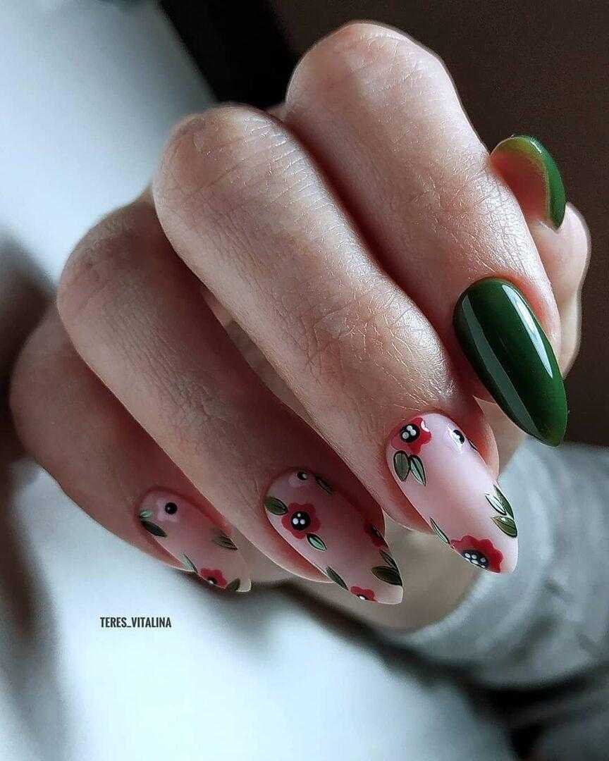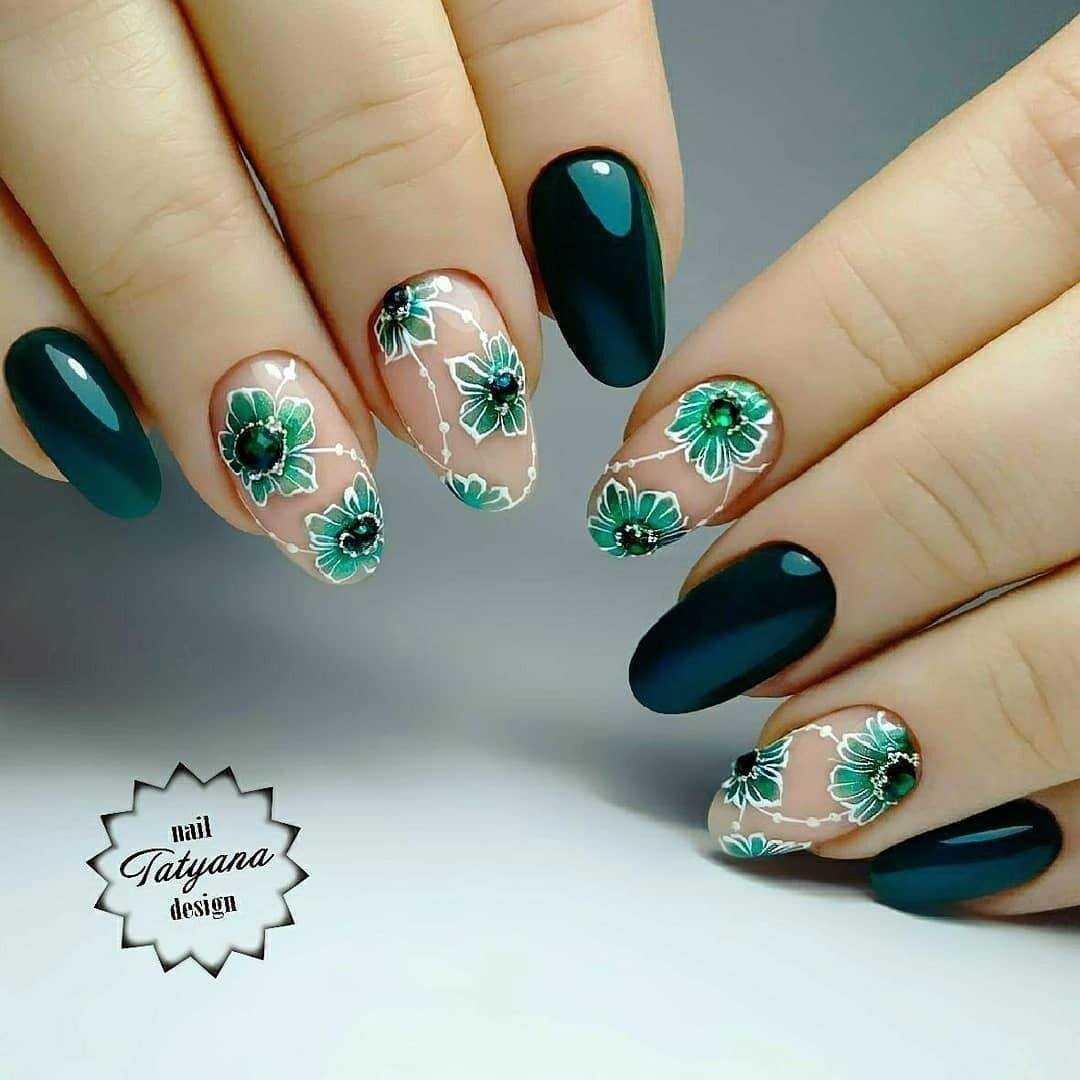 Фото мятного маникюра с цветами